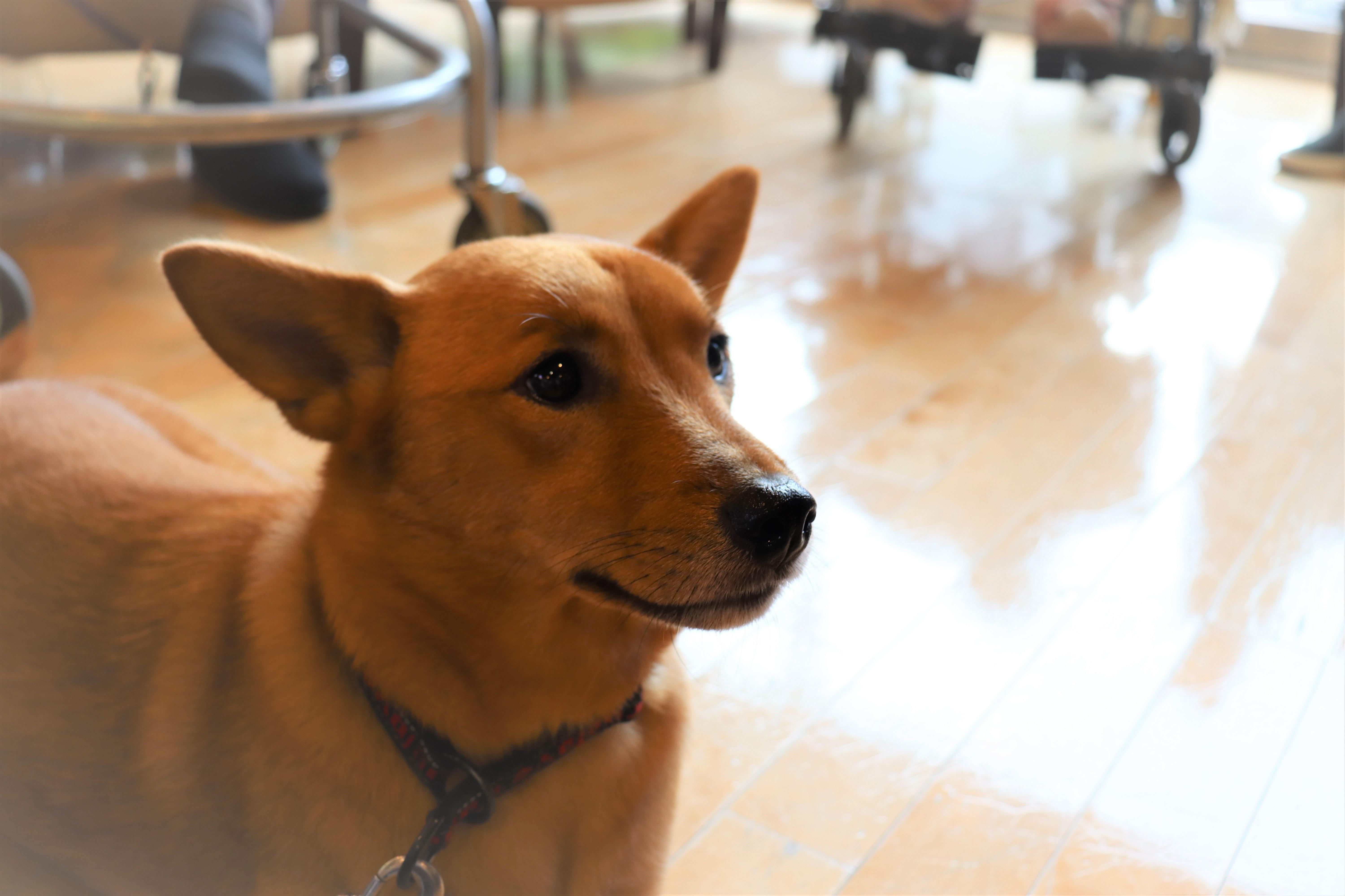 セラピー犬特訓中のふくちゃん。とっても綺麗なお顔をしています。訓練中とはいえ、皆様の足元で愛嬌たっぷりです。立派なセラピー犬になってね!