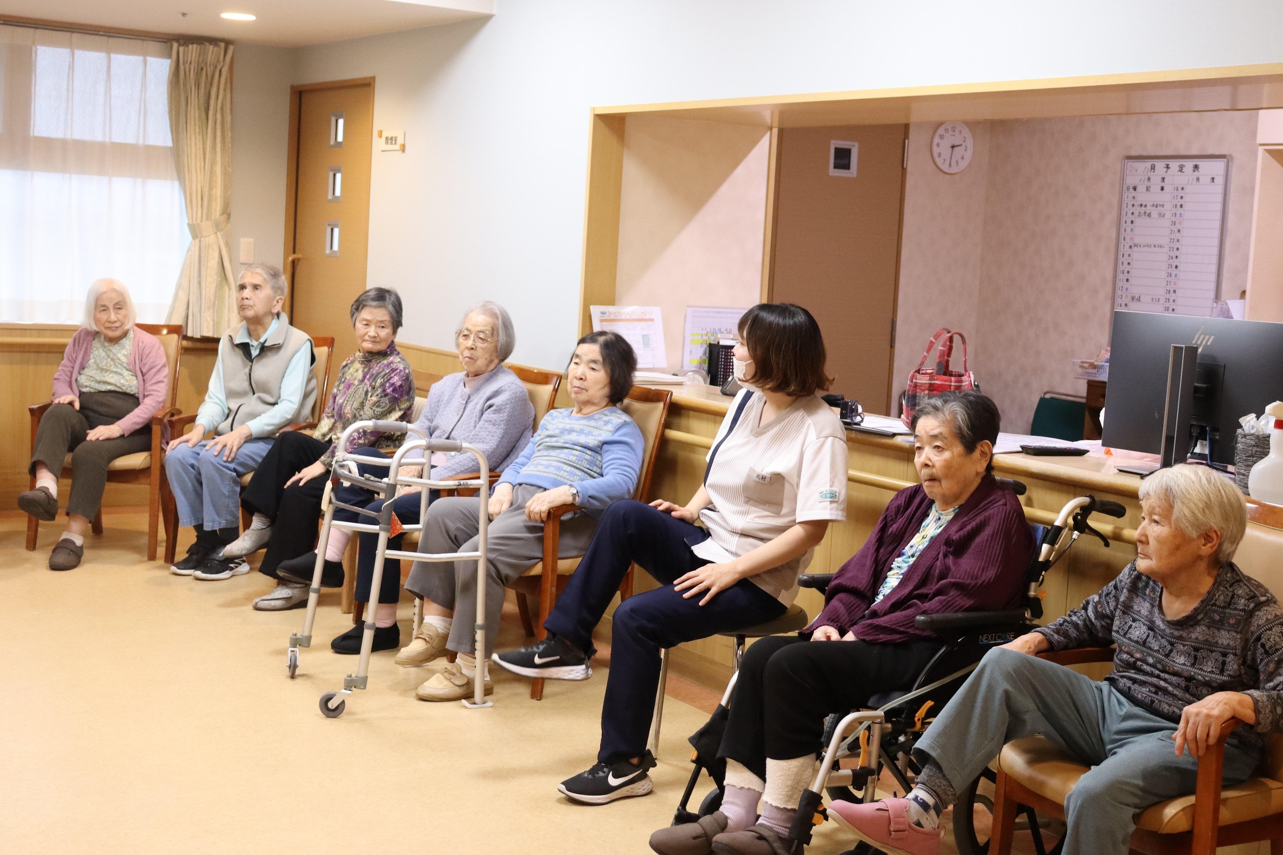 定期的に開催している〝みんなの体操〟施設では個別の機能訓練と集団の機能訓練を実施しています。