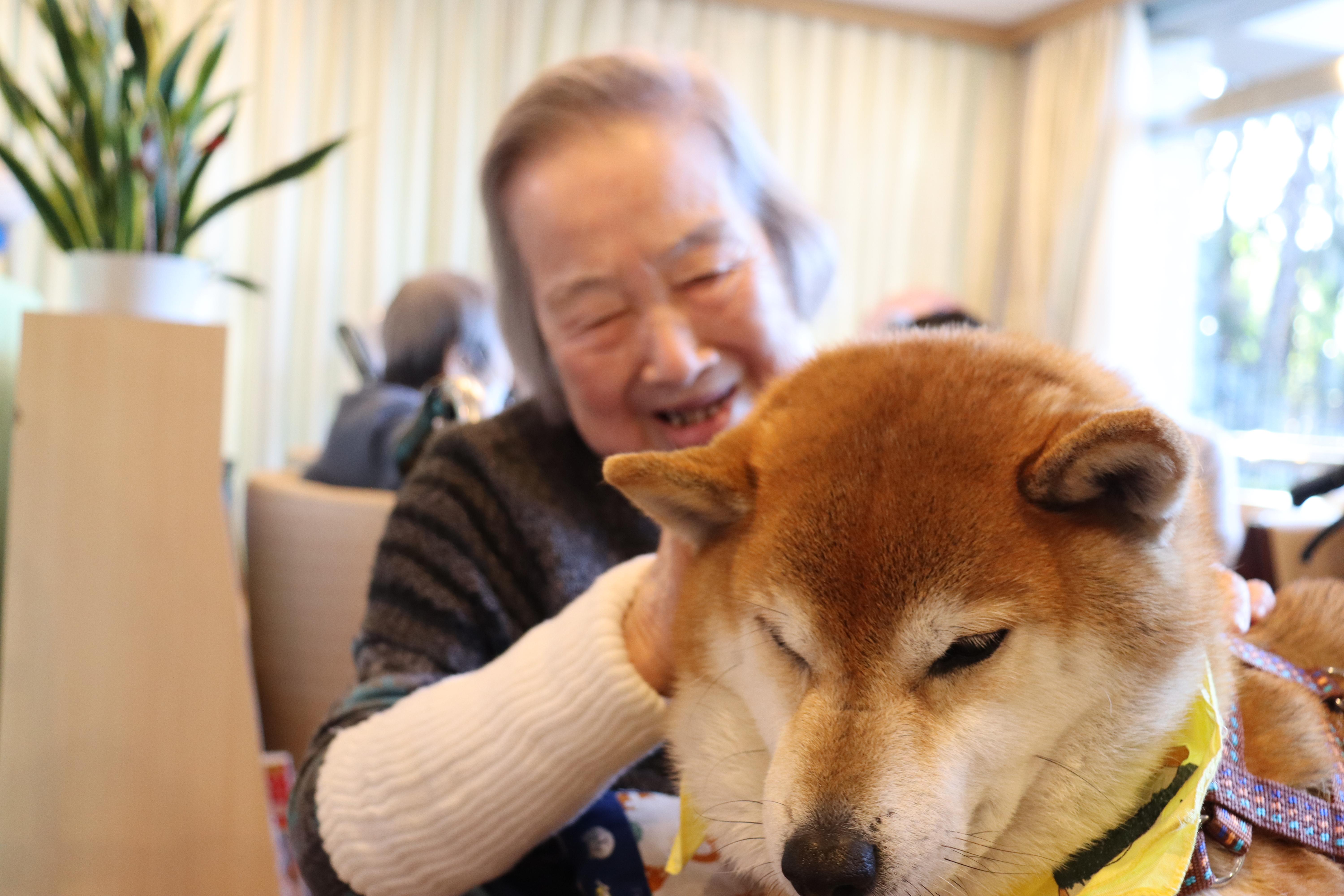 本日は大好評のドッグセラピーです!皆様、とても楽しみにしていました。柴犬のコマが来てくれました。スキンシップをはかることで癒されました。癒された皆様の表情をみると、私たちも癒されます。今回も大好評でした!!