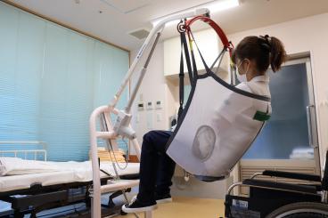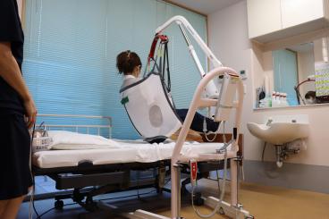 当ホームではノーリフティングケアの導入をしております。今回ご紹介するのは介護リフト「つるべ~」です。大柄なお客様をスタッフが持ち上げる介助を減らすのを目的で導入しました。