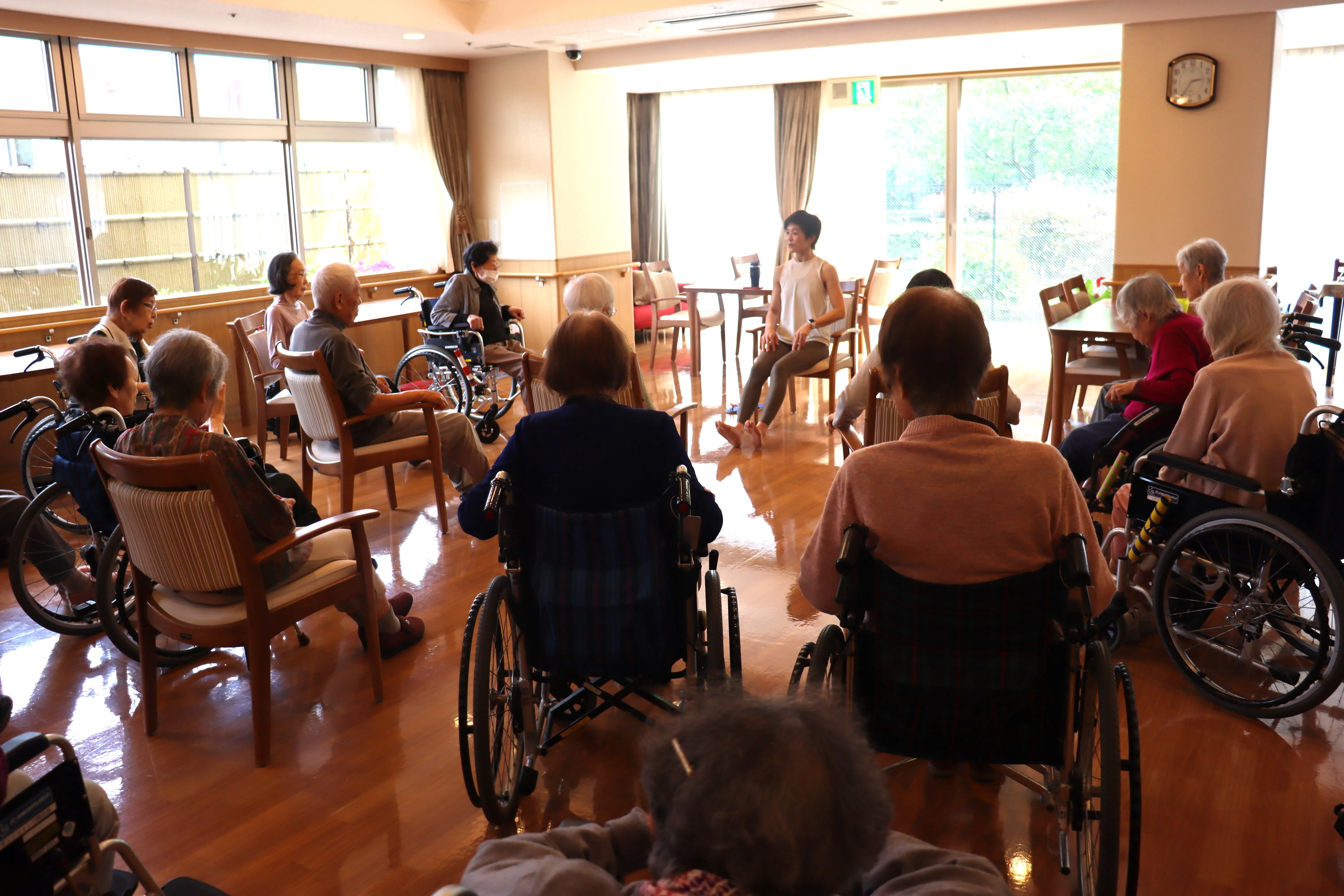 施設では月に一度、ヨガのインストラクターを招きヨガ教室を開催しております。ゆっくりと呼吸しながら身体を伸ばしたり曲げたり…最初は半信半疑のお客様も、深い呼吸とゆっくり身体が伸びていくのを感じて、あっという間に1時間が経ってしまいます。すっきりした気持ちで、さあ!おやつの時間ですよー