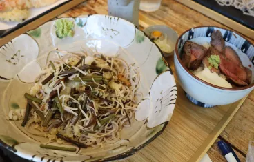 立派な天ぷらそばと山菜そばに、牛たたきのどんぶりが到着!