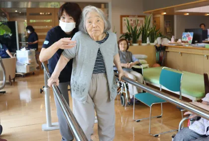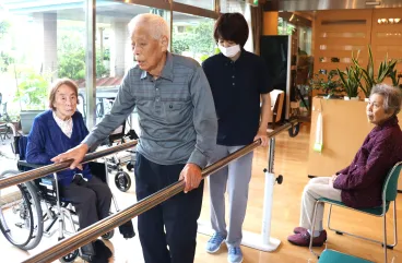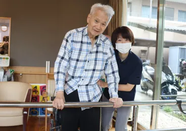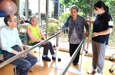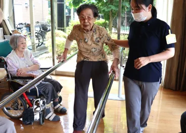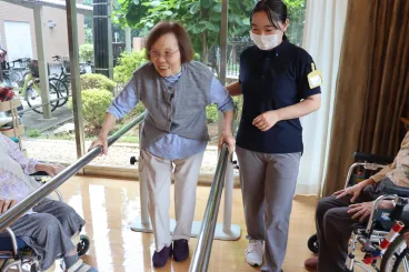 普段車椅子で移動されるお客様も、平行棒を使用しながら歩行練習を行っています。