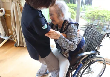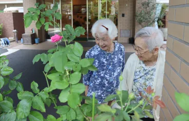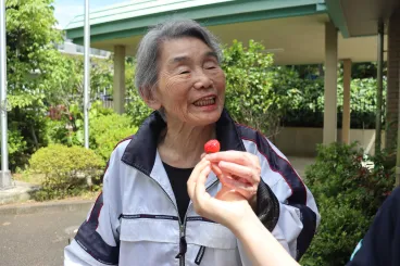 先日は体操終了後に「このまま外に出てみたいわ」というリクエストにお応えし、庭先までの外気浴を行いました。