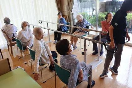 まずは平行棒を囲みながらストレッチや、座位で行える体操を実施します。