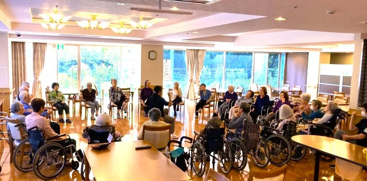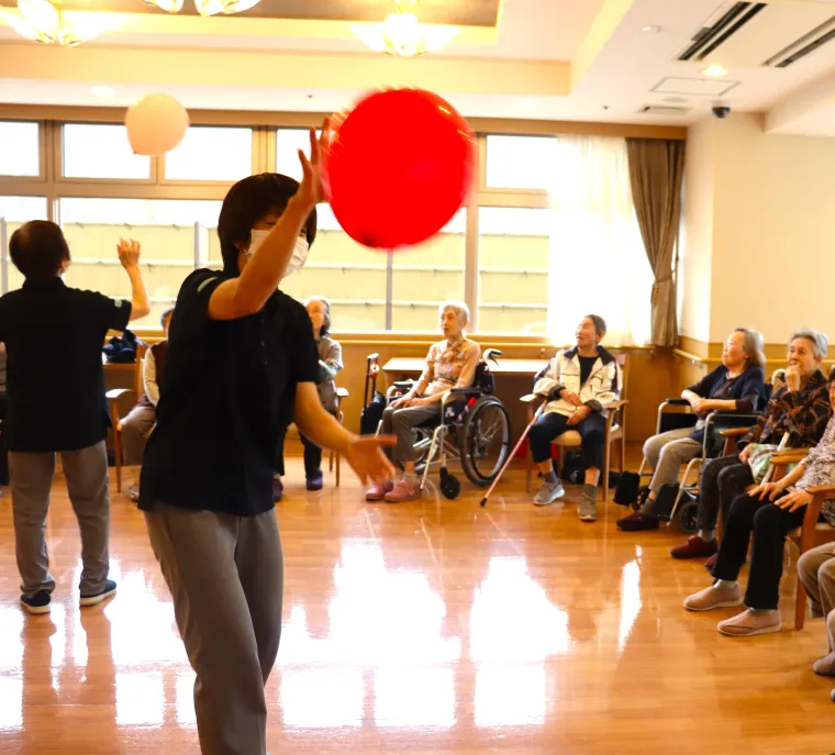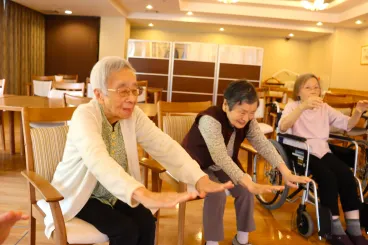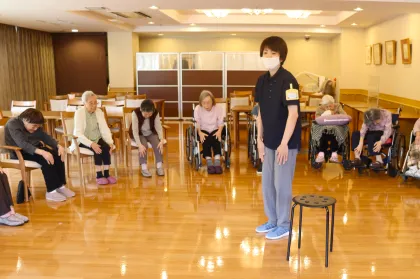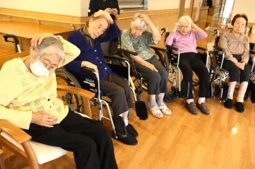 月に2~3回程度全フロアに参加者を募り、全体で体操教室を行っております。大人数での体操は、個別で行う運動と一味違って、皆さんで一丸となって行います。