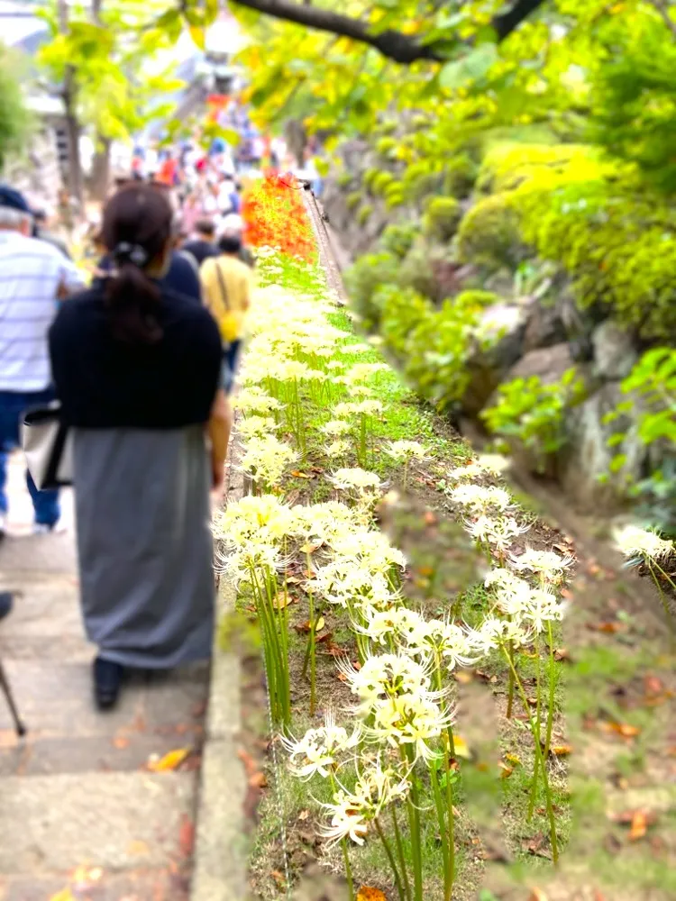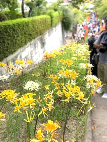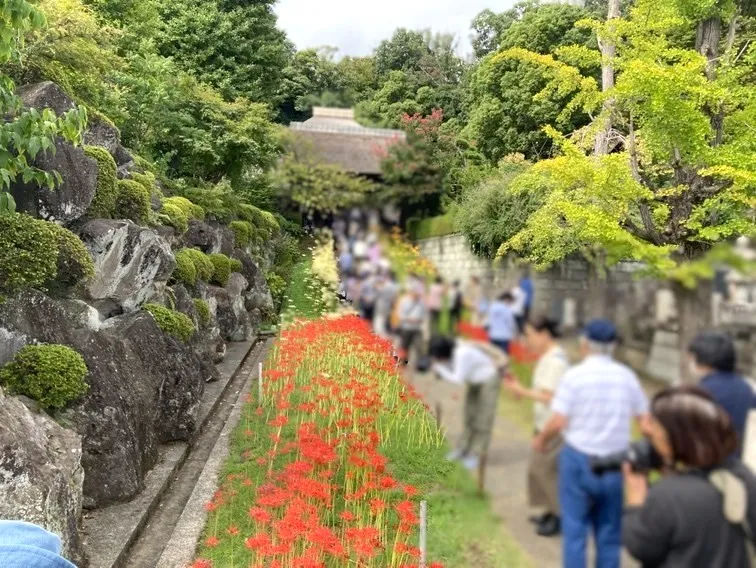 山門前の階段は沢山の人で賑わっており、皆様一眼レフカメラやスマートフォンで鮮やかに咲きほこる彼岸花を撮っておられました。