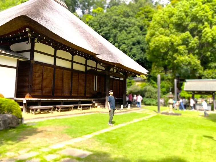 西方寺に入ると、芝生や緑がとってもがきれいな空間が広がっています。そんな緑にお客様も癒されます。そして、大きなかやぶき屋根の本堂は圧巻でした!