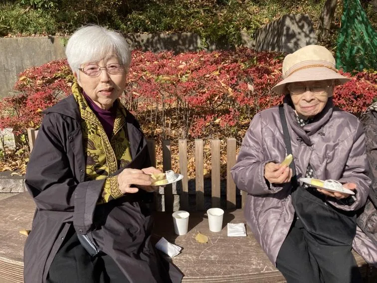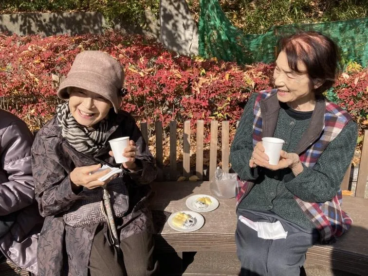 あたたかな日差しのもとで、皆さんと食べるおやつはとっても美味しくて、幸せ気分・・・。