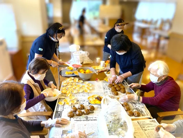 『冬カフェ』の準備は、お客様にもお手伝いいただきました!量がたくさんあったので、皆様にはひたすらお饅頭の袋を開いて、切って、切って、切っていただきました。真剣に取り組む皆様に少しだけお声掛けして、記念写真も撮りました!