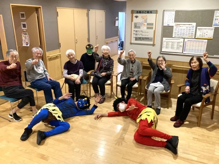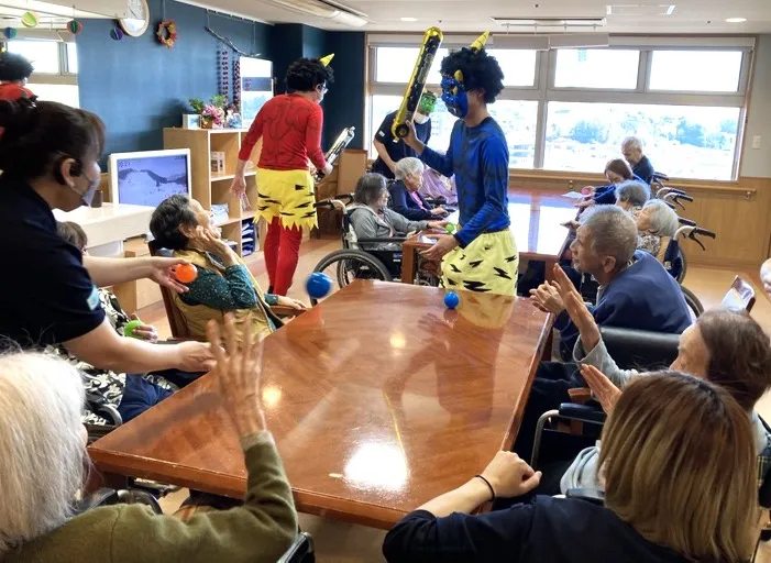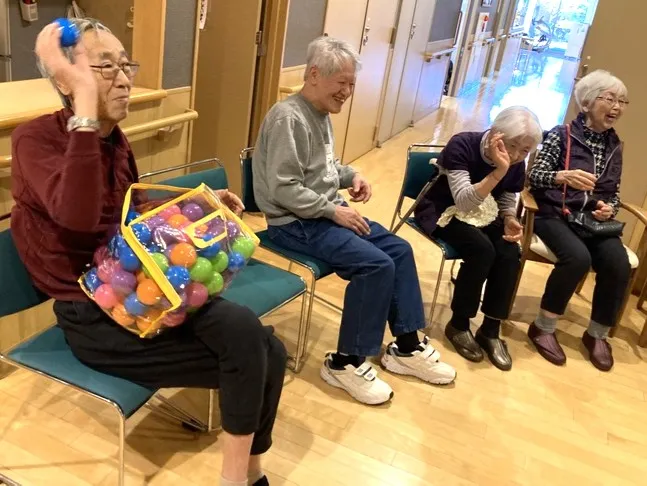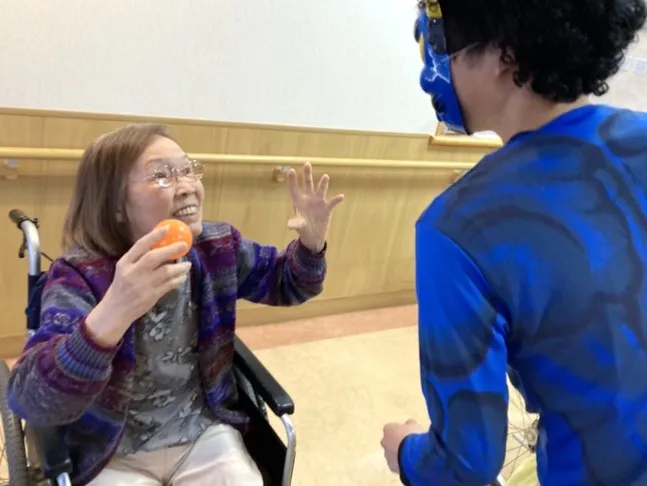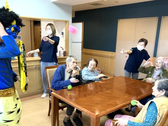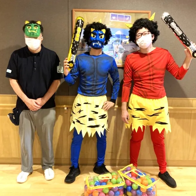 介護スタッフが仮装した鬼さんも3人登場し、「青鬼さんは誰かな?」「赤鬼さんはあの人ね」と、お客様の会話も盛り上がります。