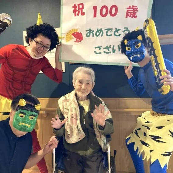 せっかく鬼さんが現れているので、2月に100歳を迎えられたお客様との記念撮影も行いました。