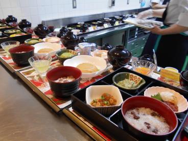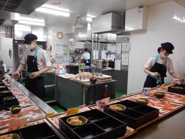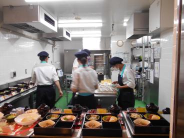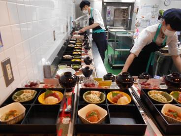 2名の管理栄養士を中心に数名のスタッフが朝は5時半から、夜は8時近くまで交代で勤務しております。