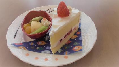バースデーケーキはショートケーキ!ガラスの器にはフルーツとプチ和菓子!