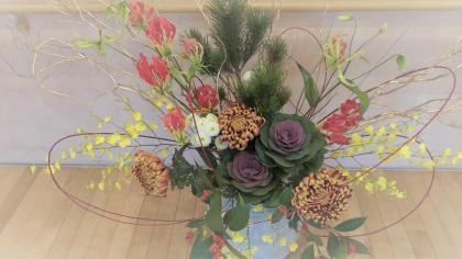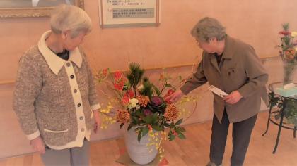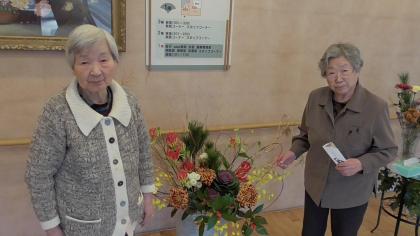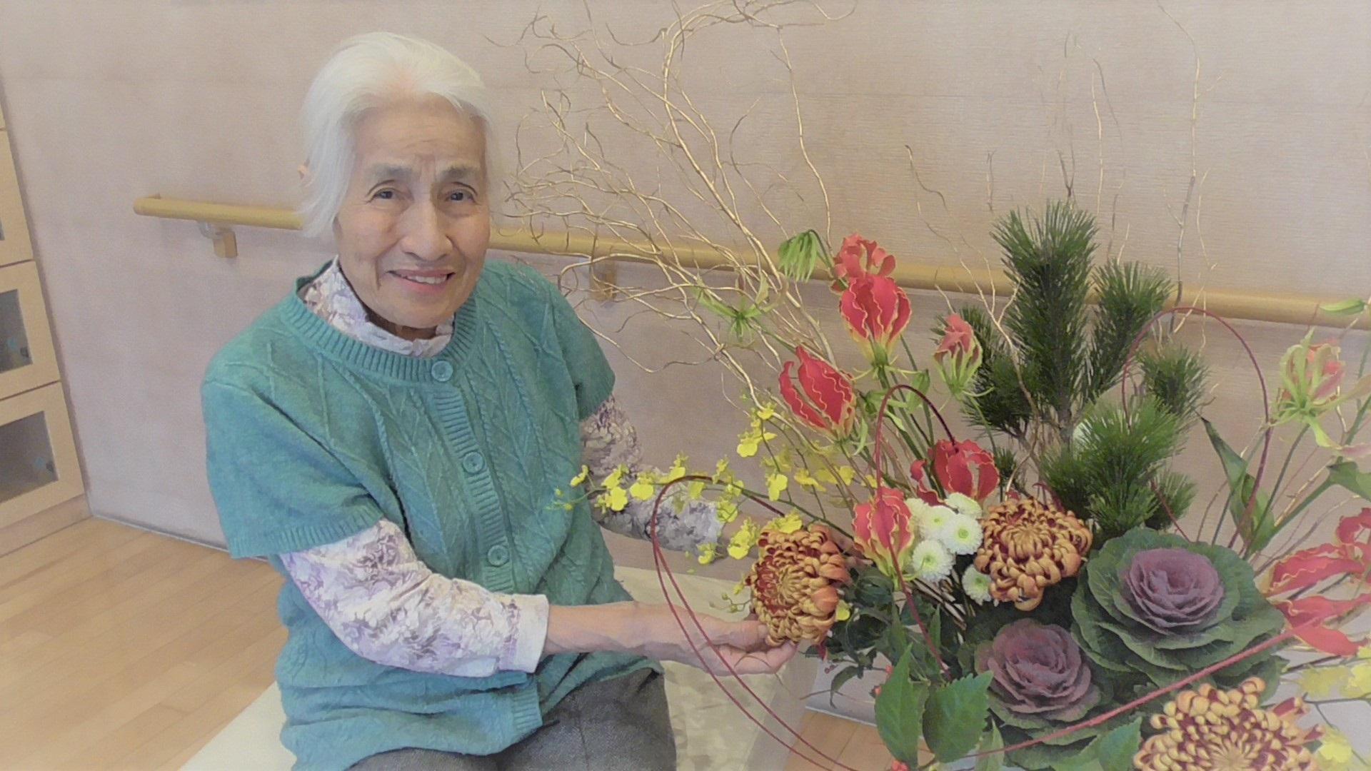 お正月の朝食の前に、施設玄関の活け花の前で写真撮影会。