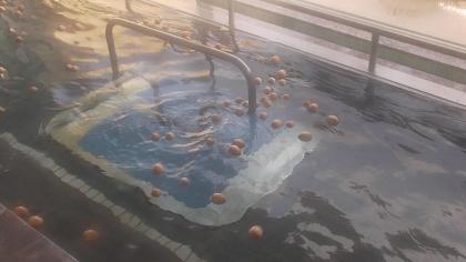 お湯に放たれたヒノキボールたち、プカプカ浮かんでます。