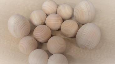 ヒノキの木を丸くカットしたボール型、そして、たまご型のボールは本物の卵パックに入っています。