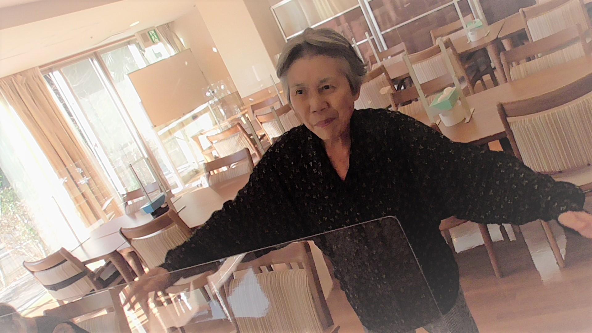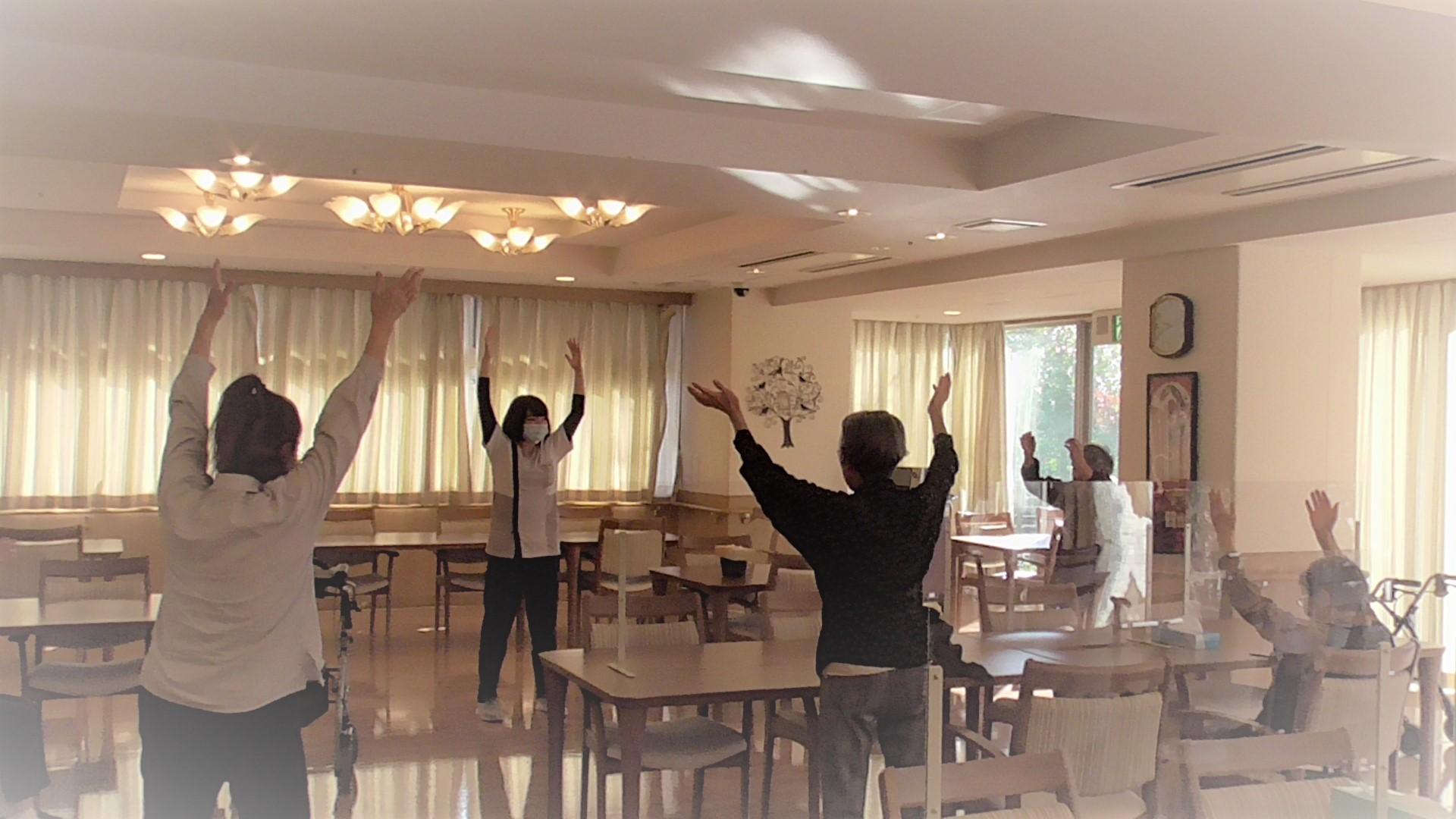 朝陽が差し込む大食堂で毎日、ラジオ体操をしてます。