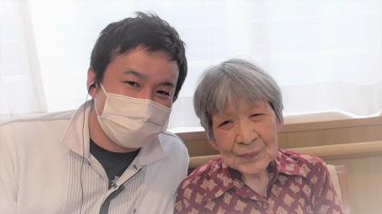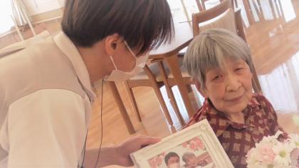 介護主任の高橋と記念撮影、フォトフレームとお花をプレゼントしました!