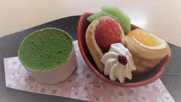 お誕生日ケーキは、小豆と抹茶のセルクルケーキと小豆のワッフルをご用意いたしました。