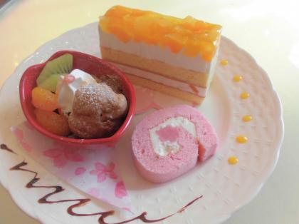 ●桜桃とリンゴのケーキと桜のロールケーキ、プチデザートの盛り合わせ