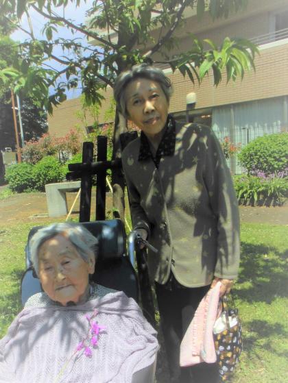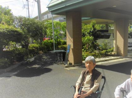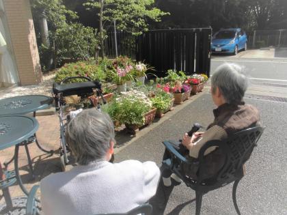 お散歩の後は、施設エントランスで日光浴。
