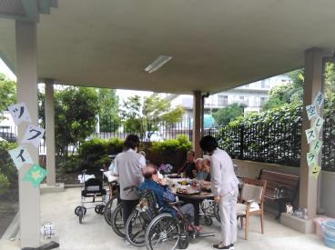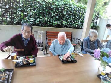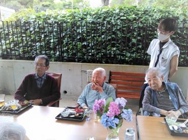 昼下がりに、施設のエントランス横で行われた〝男性の宴〟。