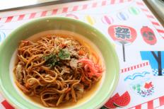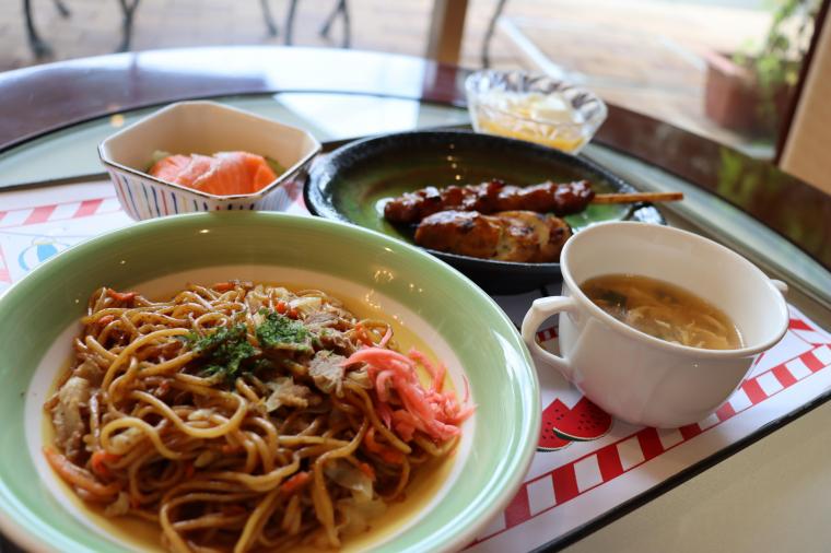 昔懐かしい屋台風のソース焼きそば、甘辛タレの焼き鳥、さっぱり味のマリネ。