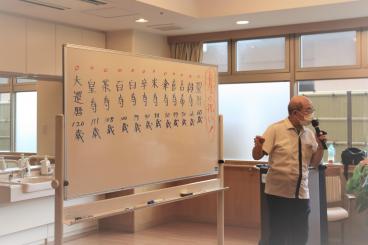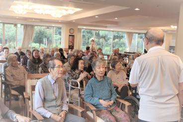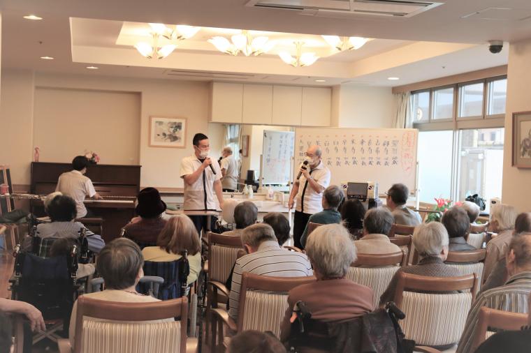 歌やゲームを楽しんでいただいたあとに、介護課主任が体を張った【二人羽織】を披露!
