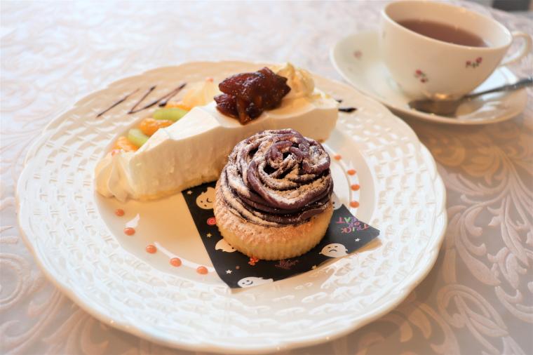 レアチーズケーキと紫芋のモンブランケーキ、真っ白のレアチーズの上にはキャラメリゼしたリンゴを添えました。