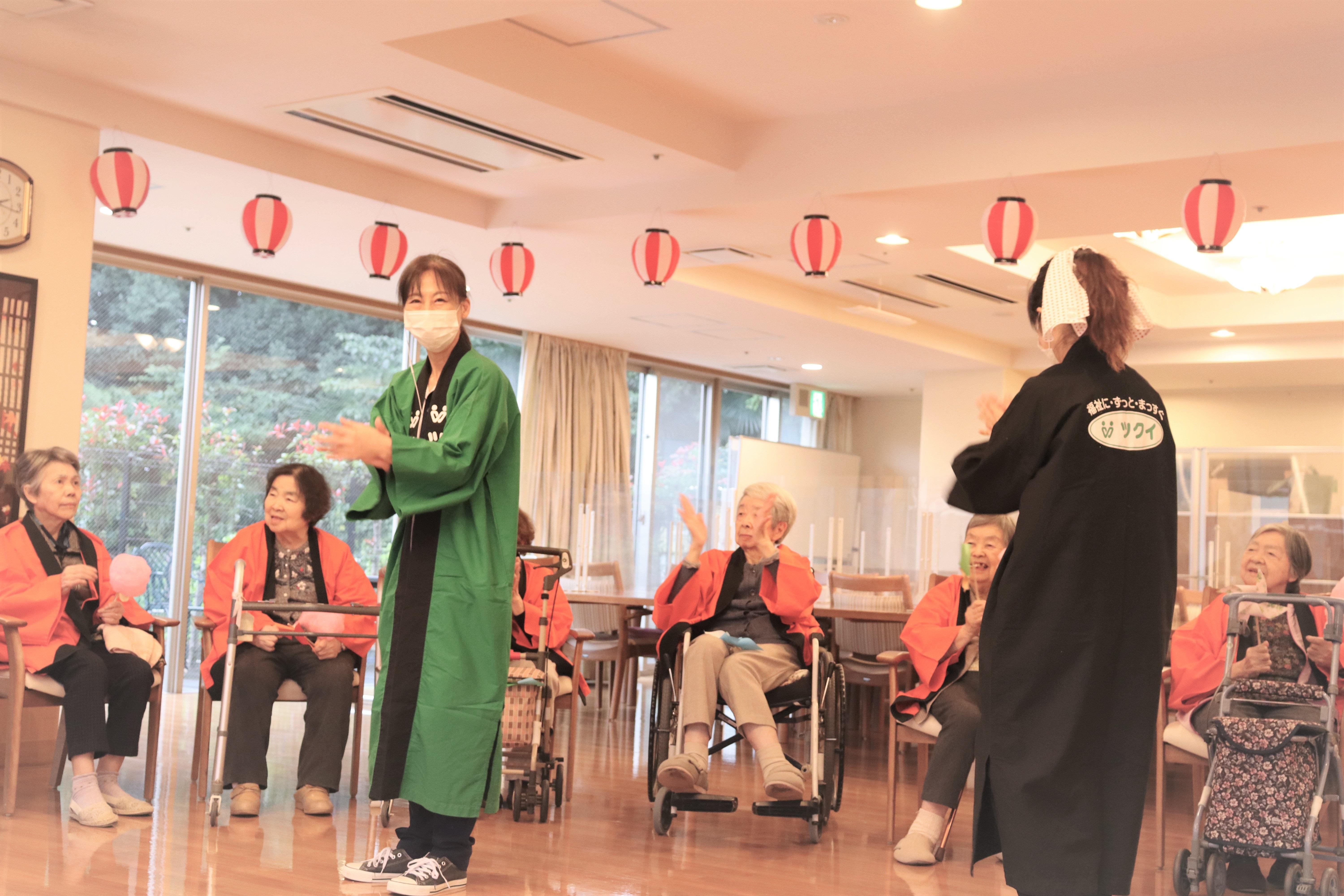 施設に鳴り響く太鼓の音、懐かしい盆踊りの曲に合わせて踊ったり、手拍子をしたり、あっという間にお祭りモードになりました。