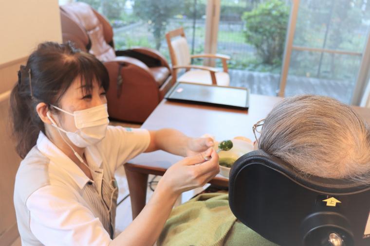 トロミをつけたお抹茶、ほろ苦いお抹茶と甘いデザートを交互に召し上がって頂くと、介護スタッフにとびっきり素敵な笑顔を見せてくださいました!