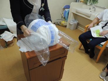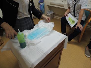 オムツの当て方、水分を吸収する仕組み、機能、どれくらいの量を吸収するのかなどを、実際に人形を使っての研修を行いました。