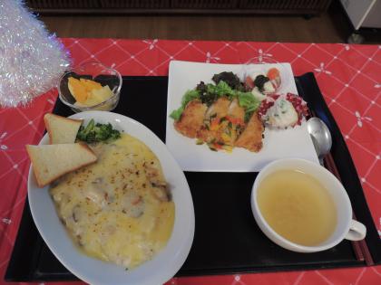 スノーチーズグラタン、フライドチキン、ツリー型のポテトサラダ、カプレーゼ、オニオンスープといったメニューです。