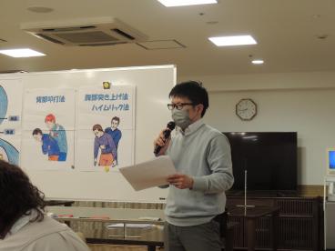窒息事故発生時の対応については、背部叩打法やハイムリック法のデモを行い、実際に皆さんにも体験をしていただきました。