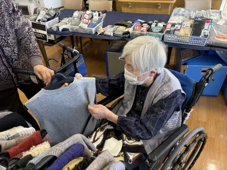 本日は、施設内にて洋服の出張販売を開催しました。外出が難しい季節でも、お客様がゆっくりとお買い物を楽しんでいただけるよう、季節に合ったあたたかな洋服や小物をたくさんご用意いただきました。