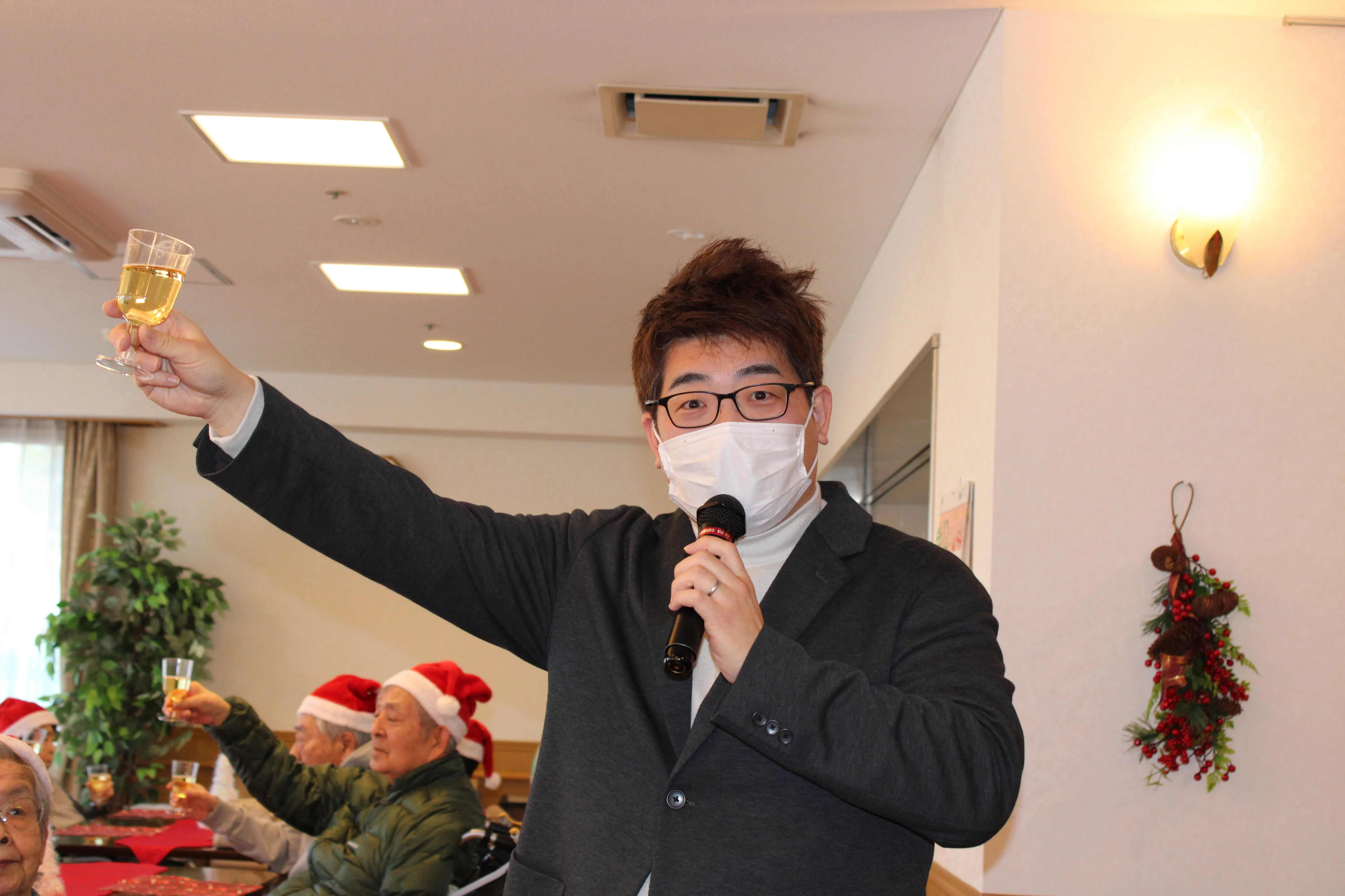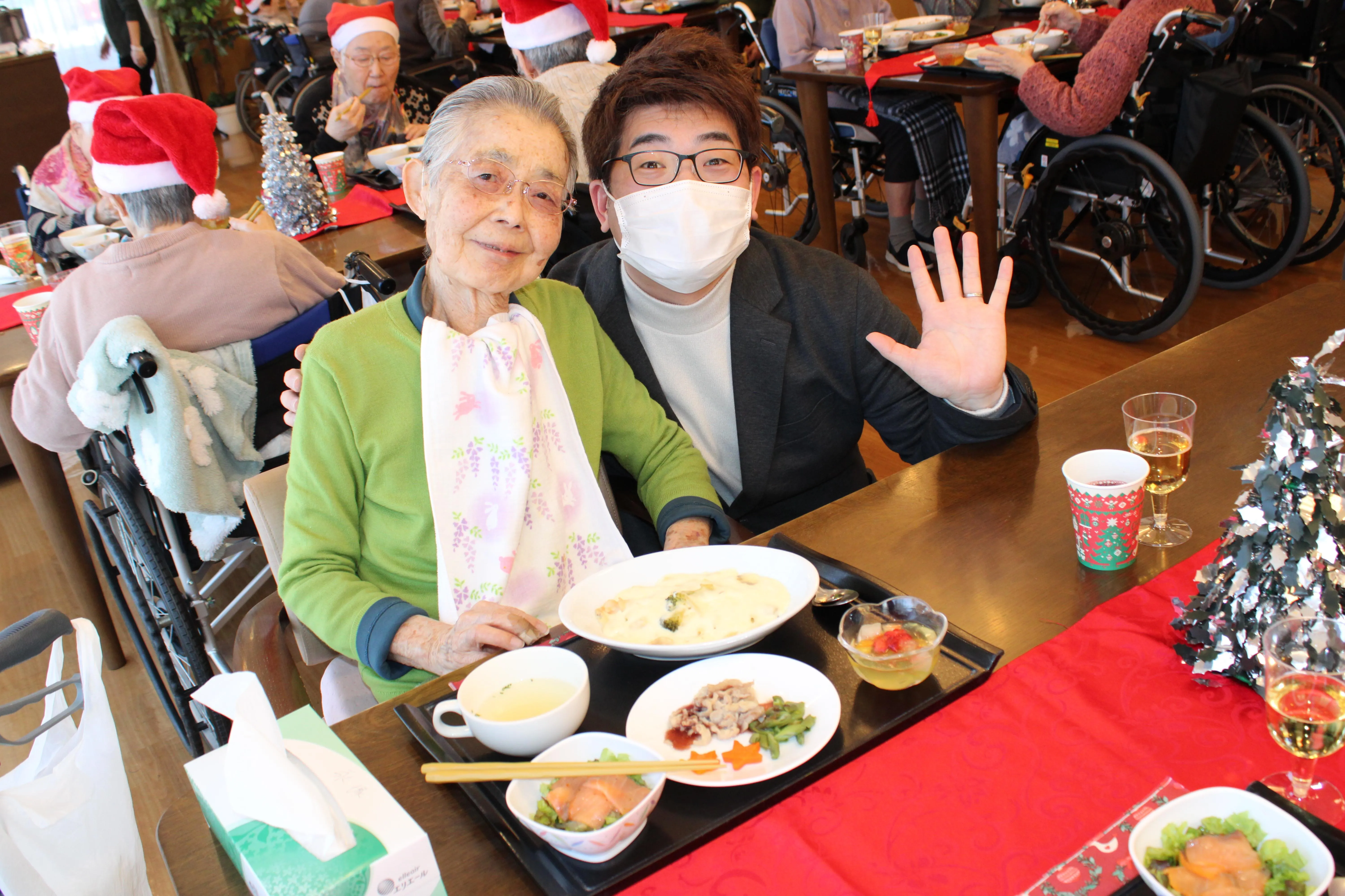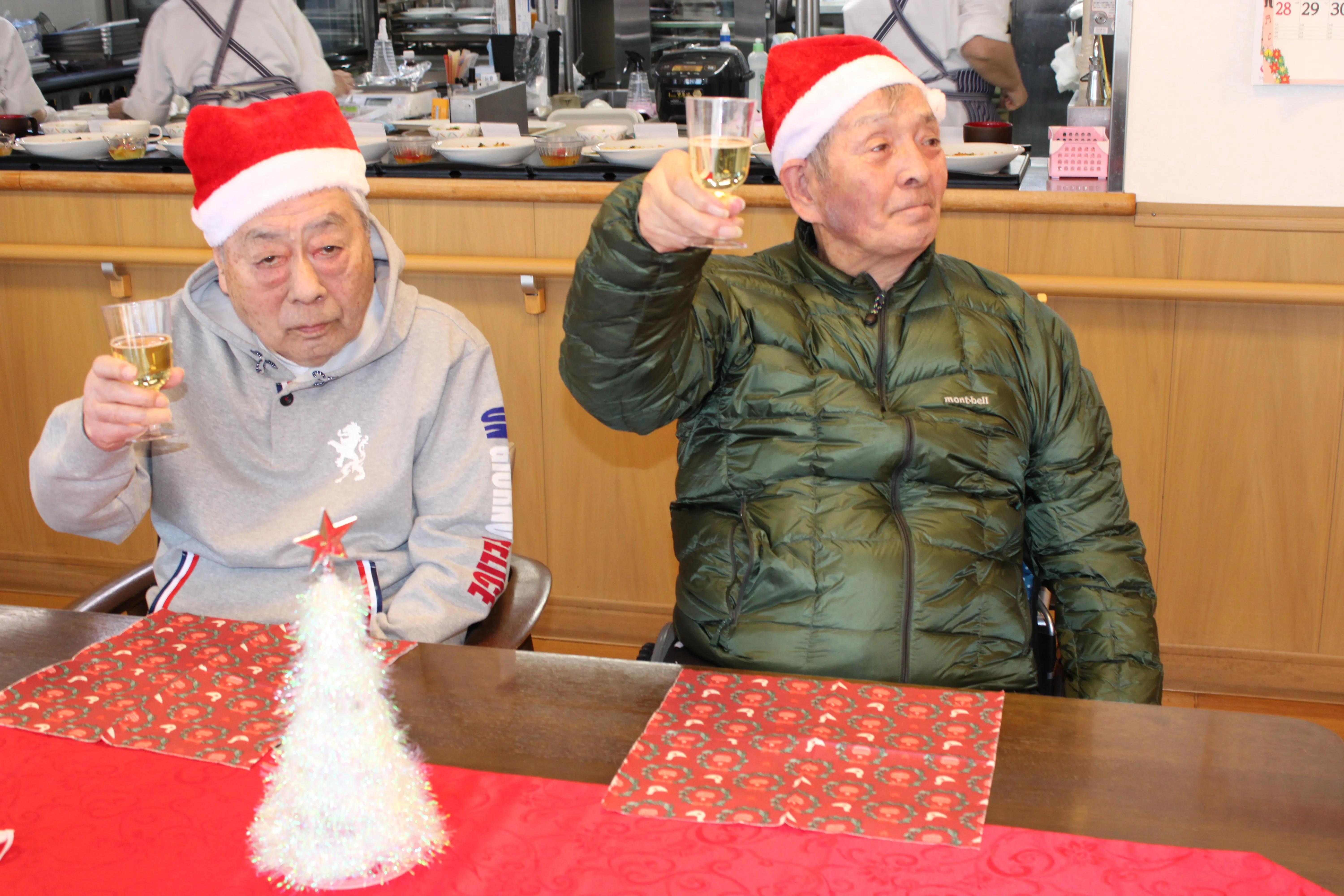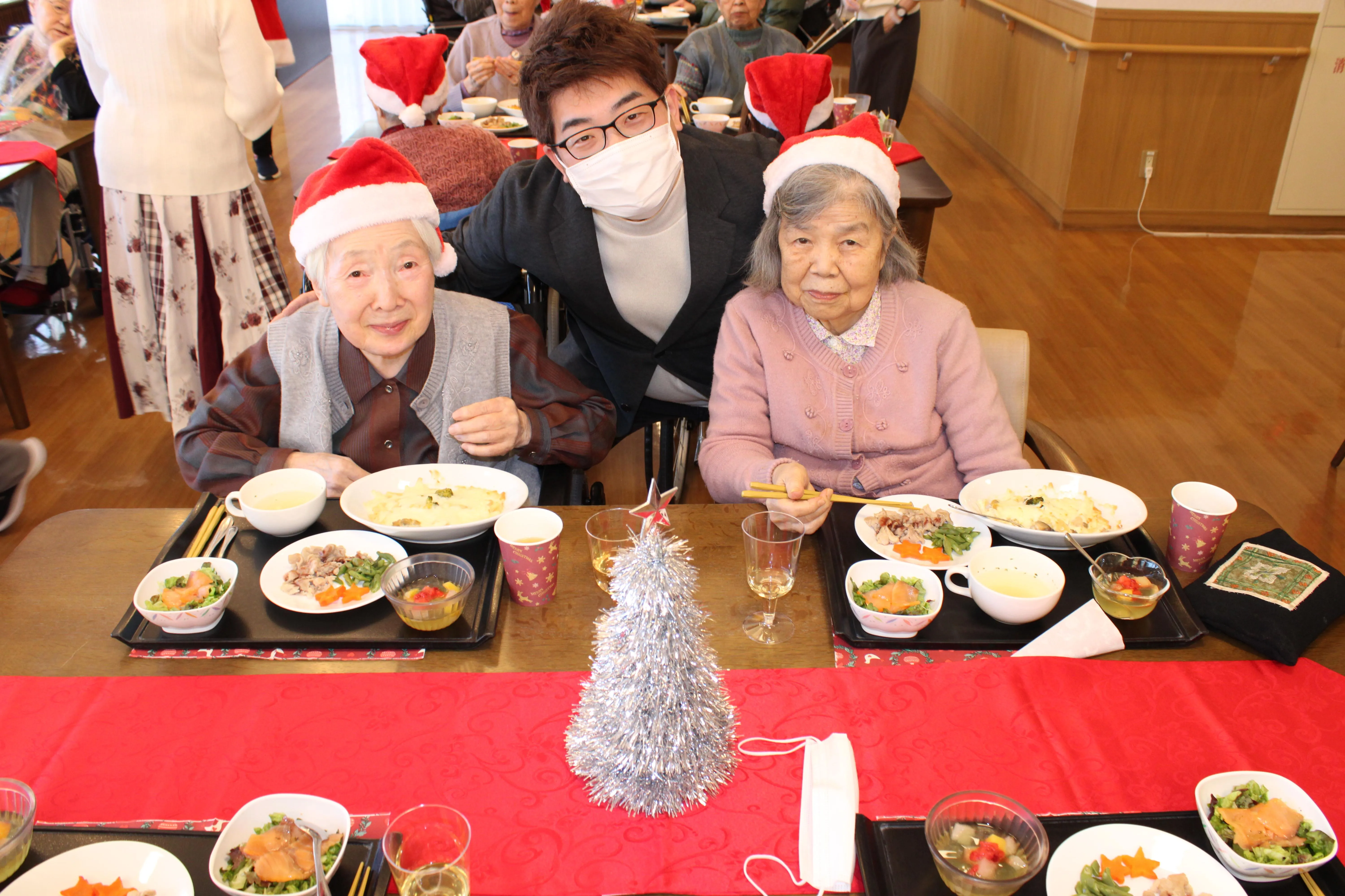 12月に入り、館内はすっかりクリスマスムードに包まれています。今年も、皆さまが楽しみにされているクリスマス会 を開催しました。当日は朝からキラキラした飾りつけに、「今日は楽しみだね」「ワクワクしてきたよ」と笑顔があふれ、会場全体が温かな雰囲気に。