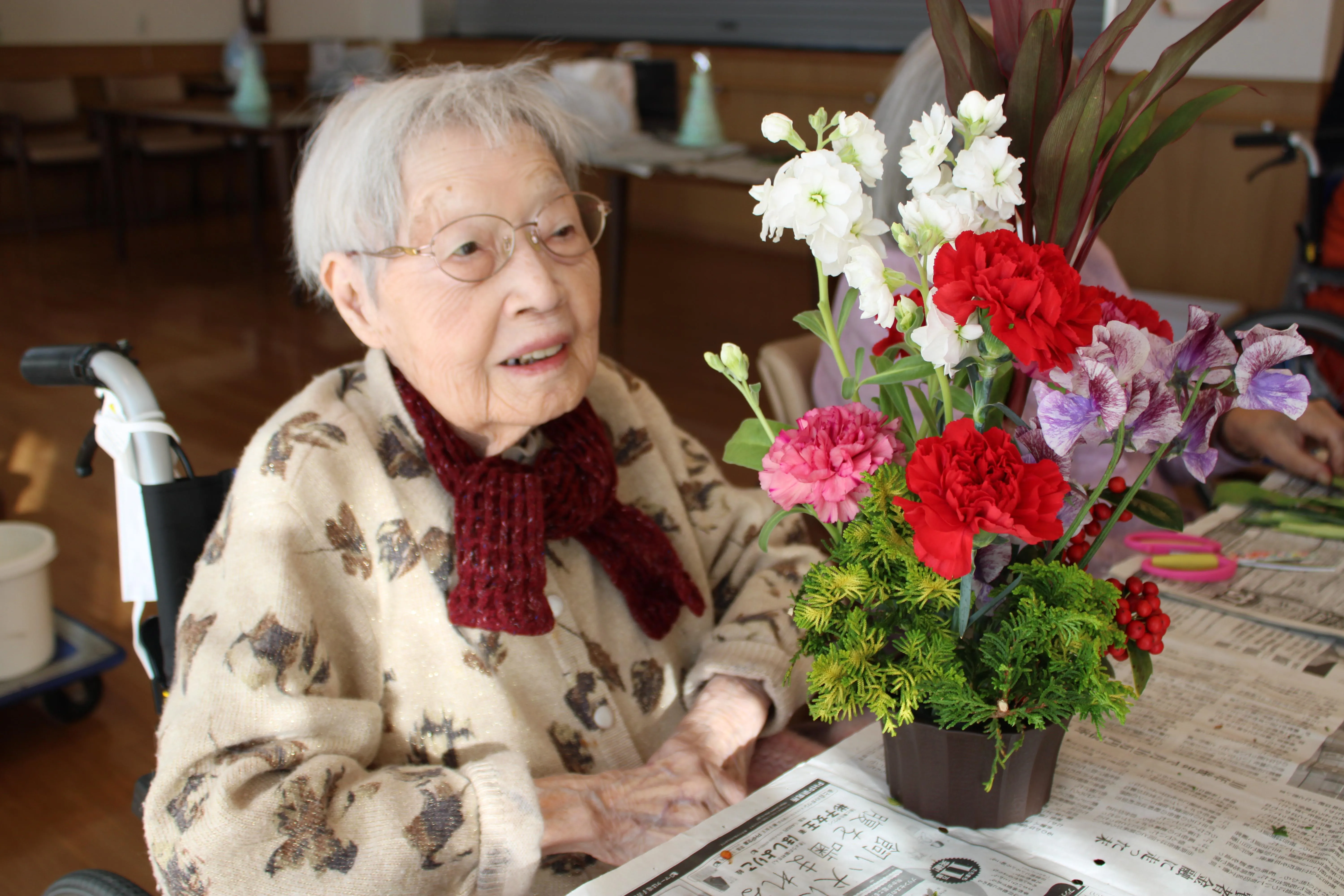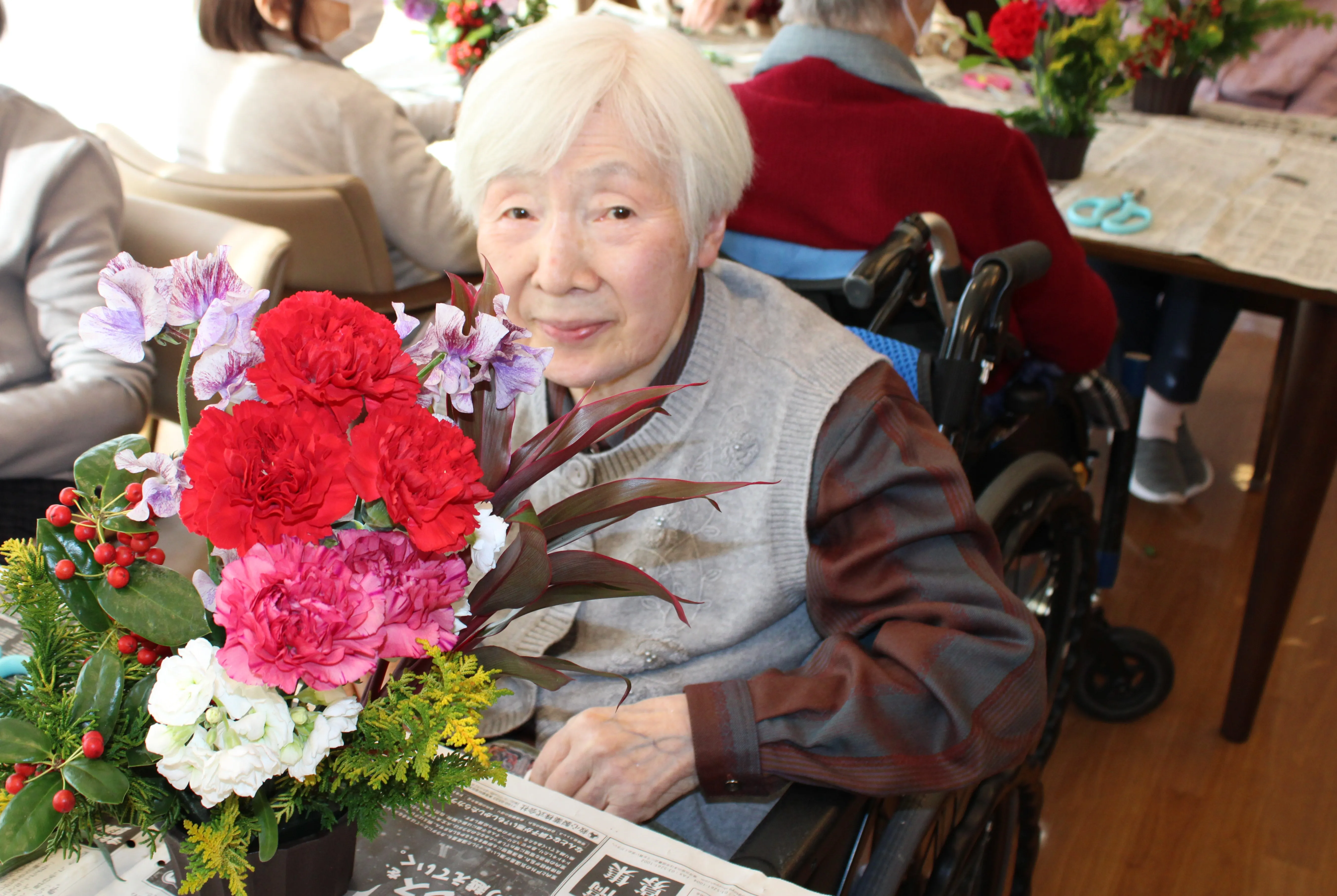 完成した作品は施設内に飾られ、冬の空間にやさしい華やぎとぬくもりをもたらしています。季節の花に触れながら、心がほっと和らぐ、穏やかなひとときとなりました。