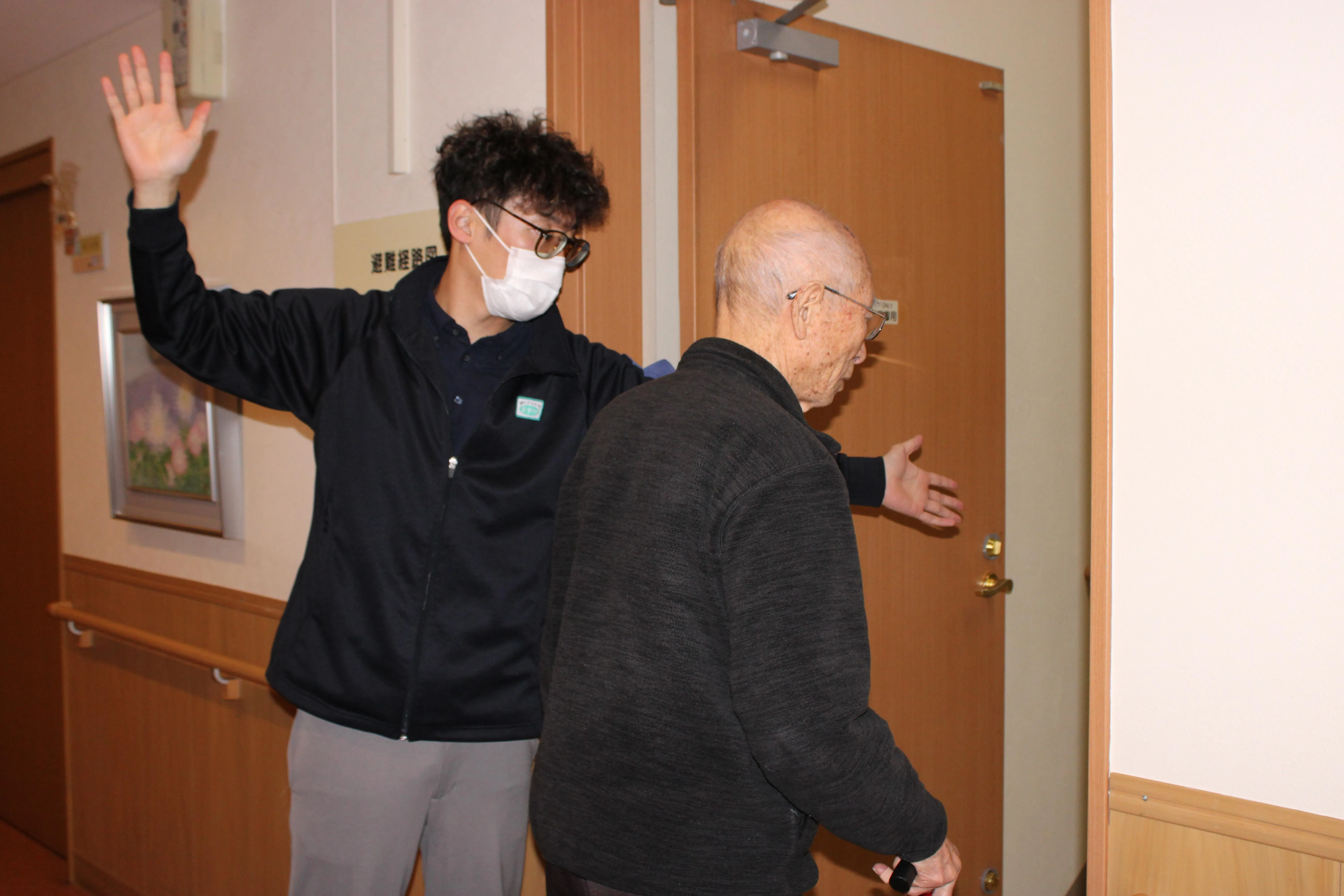 スタッフの人数が少なくなる時間帯を想定し、お客様一人ひとりの安全を守ることを大切にしながら、声かけや誘導の方法、居室からの避難経路を確認しました。