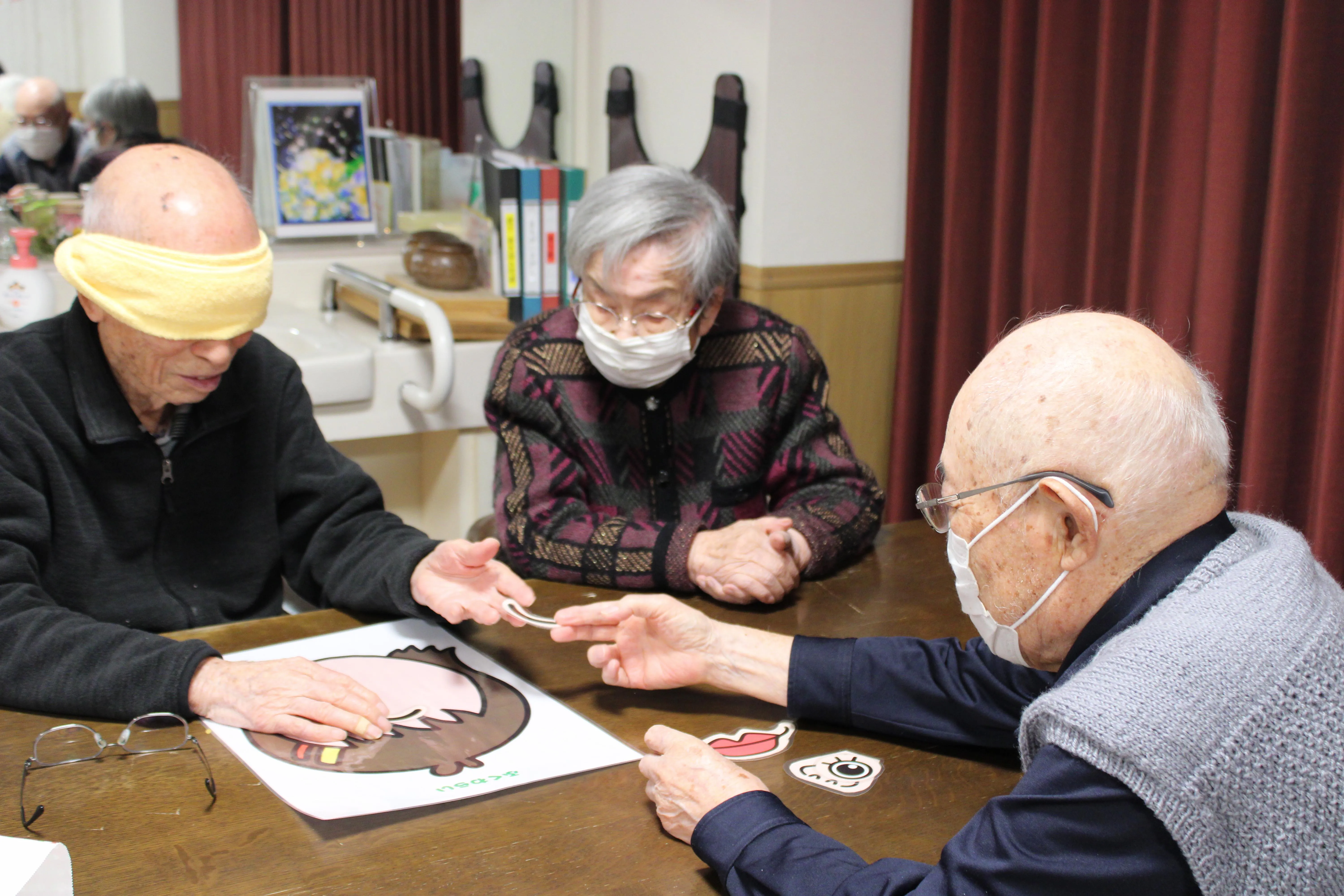 福笑いでは、目や口の位置に思わず笑いがこぼれ、完成した顔を見て「これは誰に似ているかな?」と会話も弾み、和やかな時間となりました。