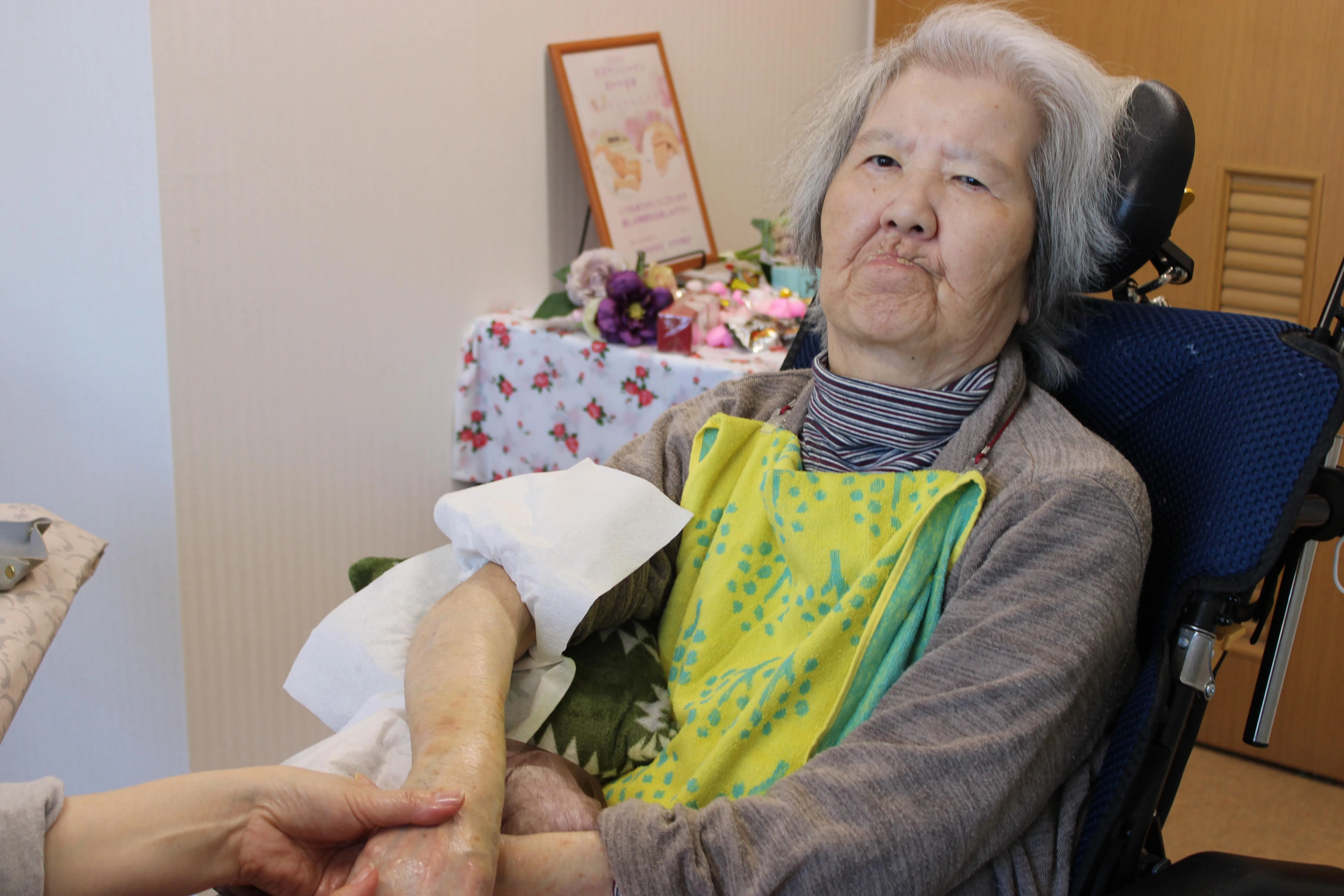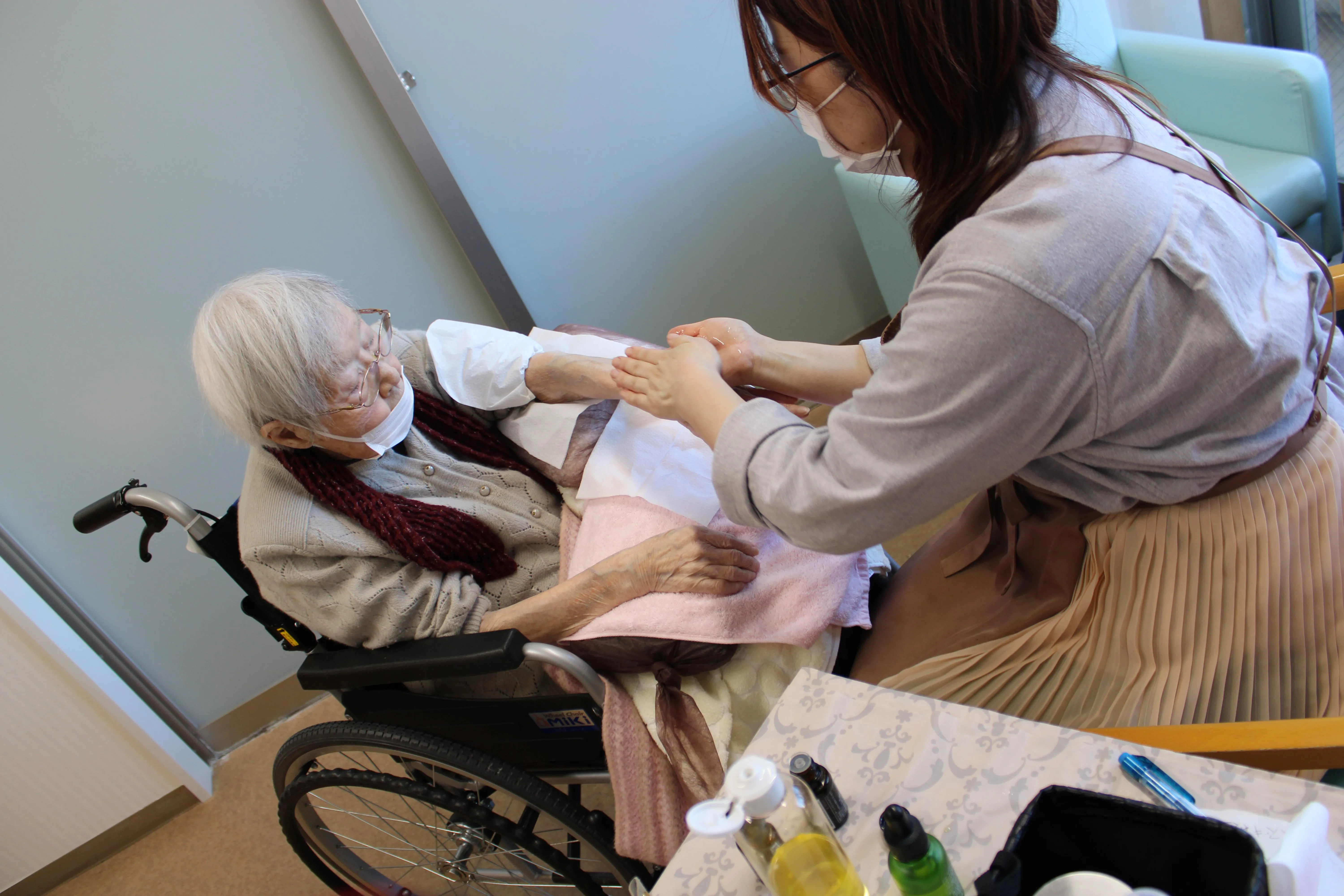 手元をやさしくほぐすハンドマッサージでは、「気持ちいいね」「手が軽くなった」と自然と笑顔がこぼれ、フェイシャルエステでは、ゆったりとした時間の中で心も体もリフレッシュしていただきました。