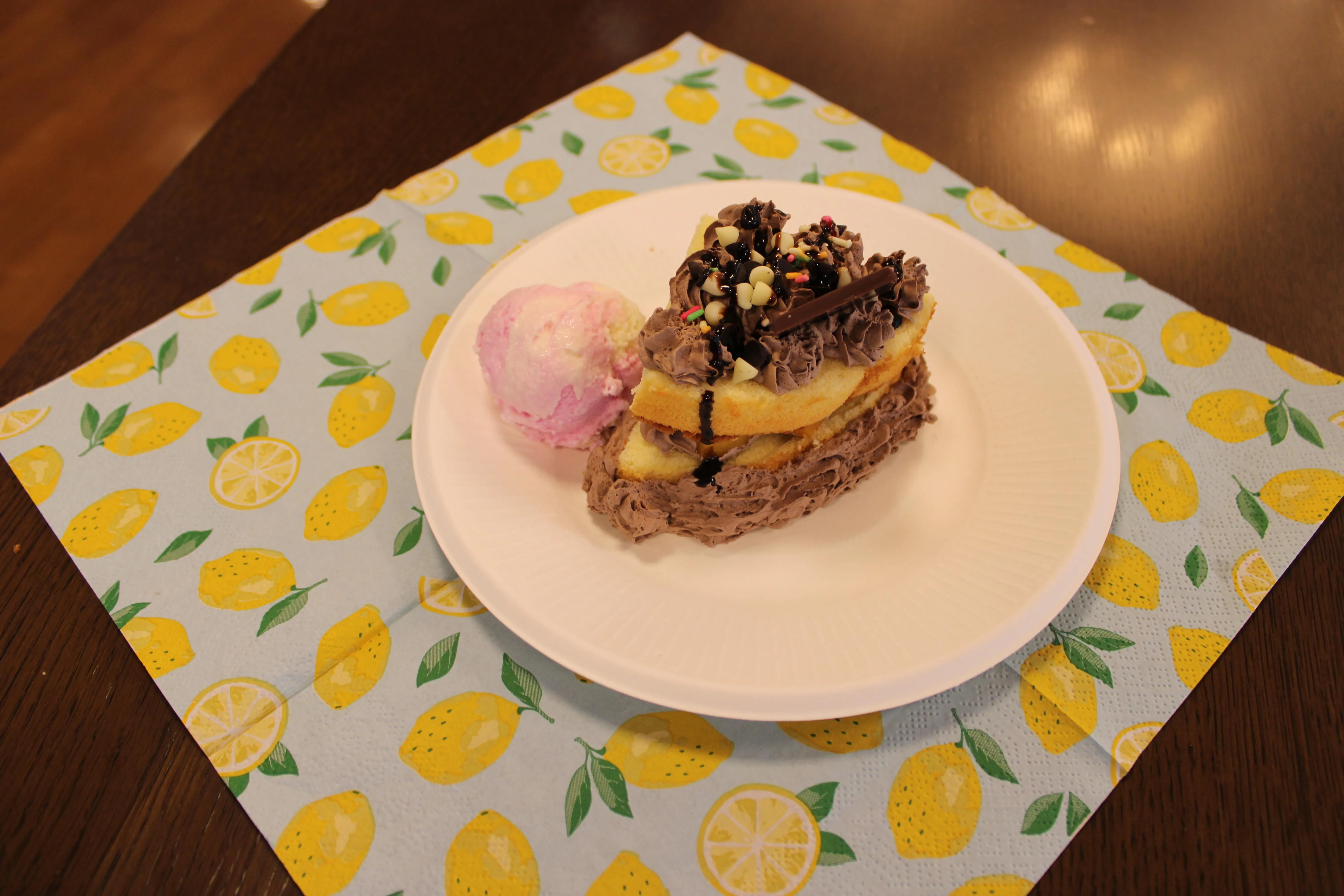 ふんわりとしたスポンジにチョコホイップを重ね、色とりどりのフルーツをたっぷりトッピング。仕上げにはチョコレートソースを贅沢にかけ、見た目も華やかな一皿が完成しました。さらにアイスクリームも添えて、ボリューム満点の特別デザートに。