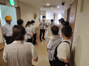 火災の場合は上から下にお客様を誘導するのですが、水害の場合は下から上です。