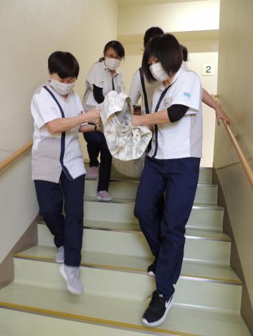 そして、優先度の高いお客様から非常口まで搬送。続々応援のスタッフが駆け付けます。そして車椅子の方は椅子に乗り移り、1Fまで避難しました。