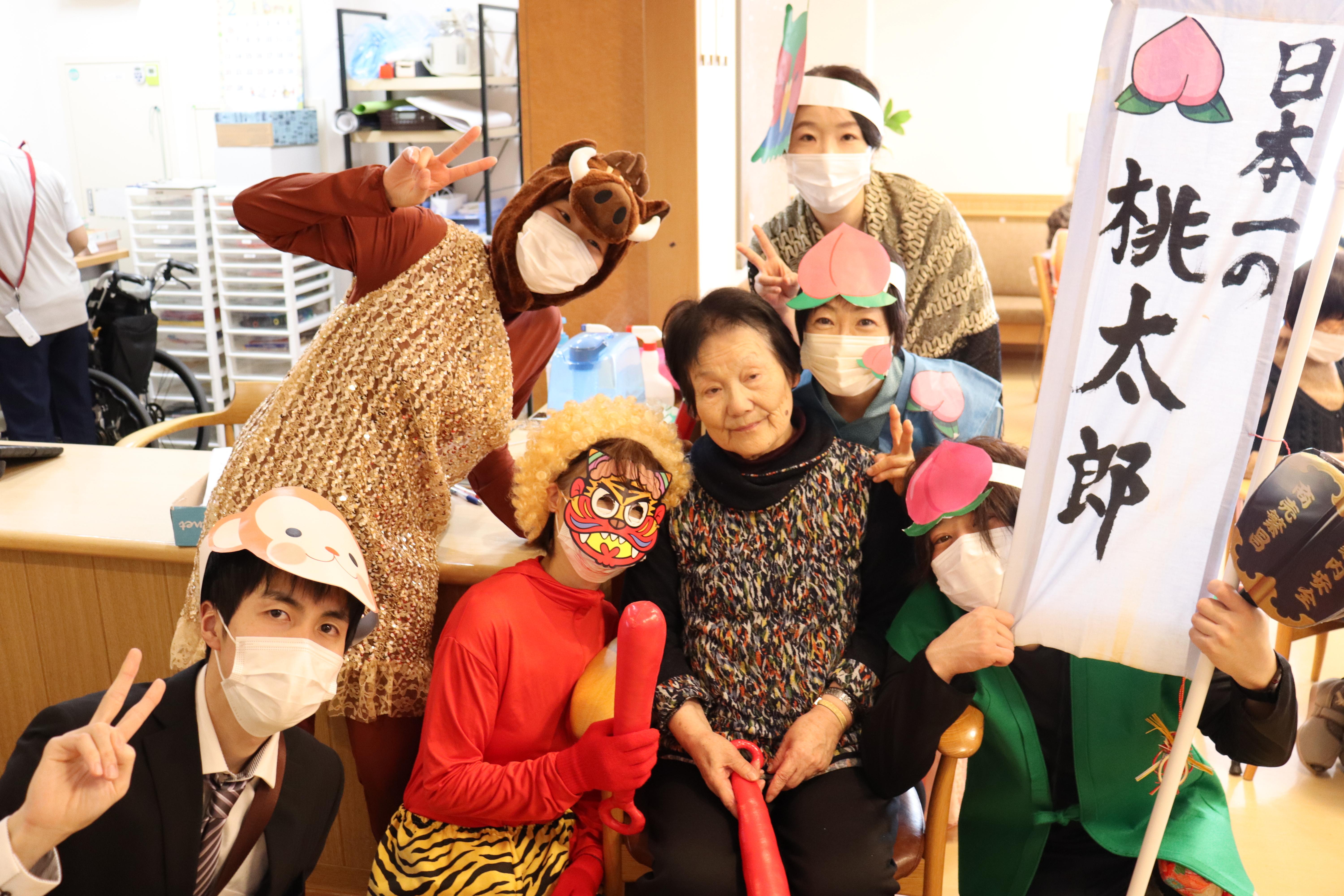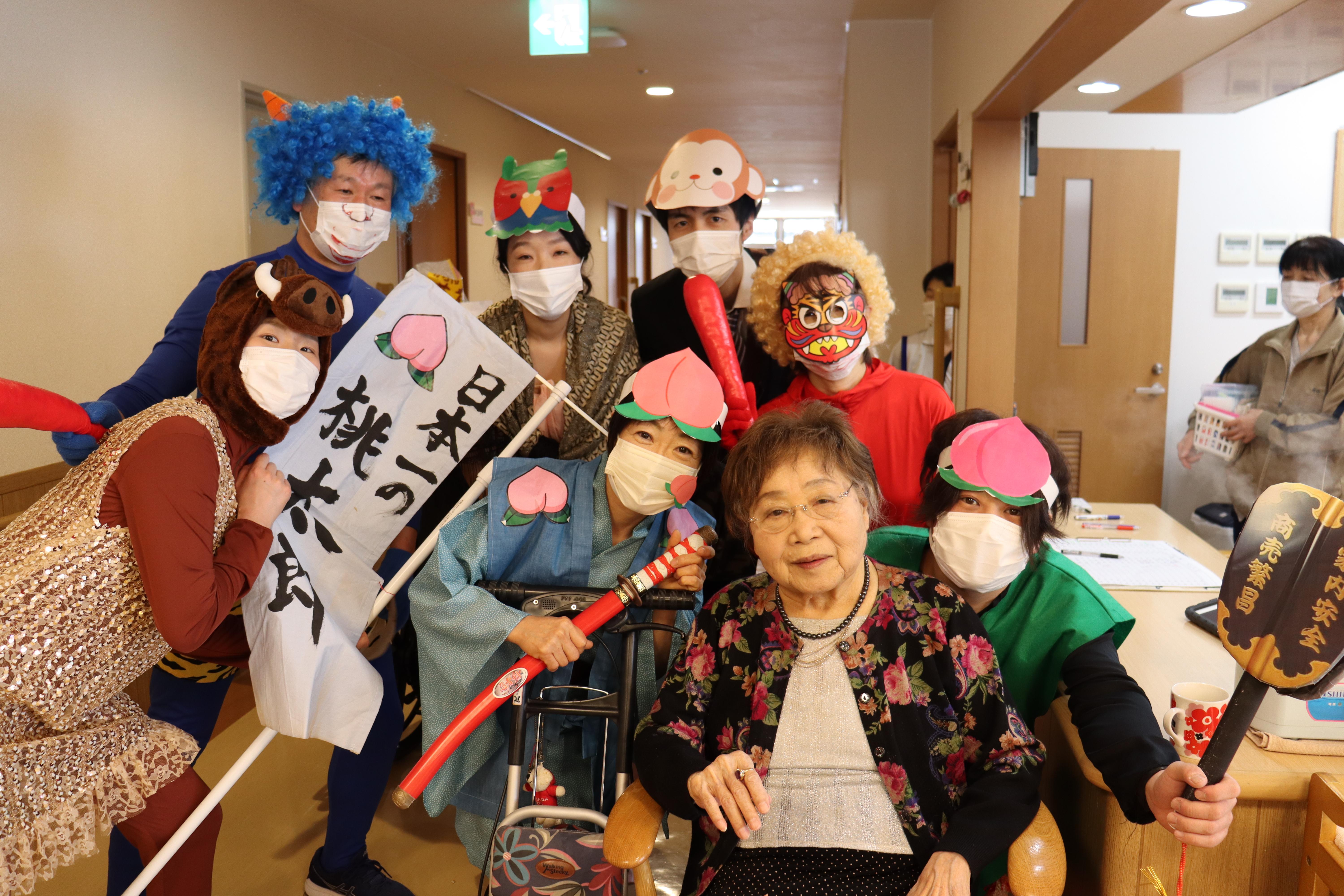各フロアで豆まきを行いました!スタッフの余興で「桃太郎」を楽しんでいただいた後に、鬼に向かって豆を投げてもらいました。