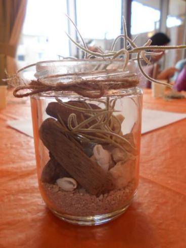 テラリウムとは、エアープランツというほとんど水をあげずに育つ植物を、瓶の中に石や貝、流木などを飾り付けた中に植え込み、瓶の中に自然環境を作り楽しむものです。