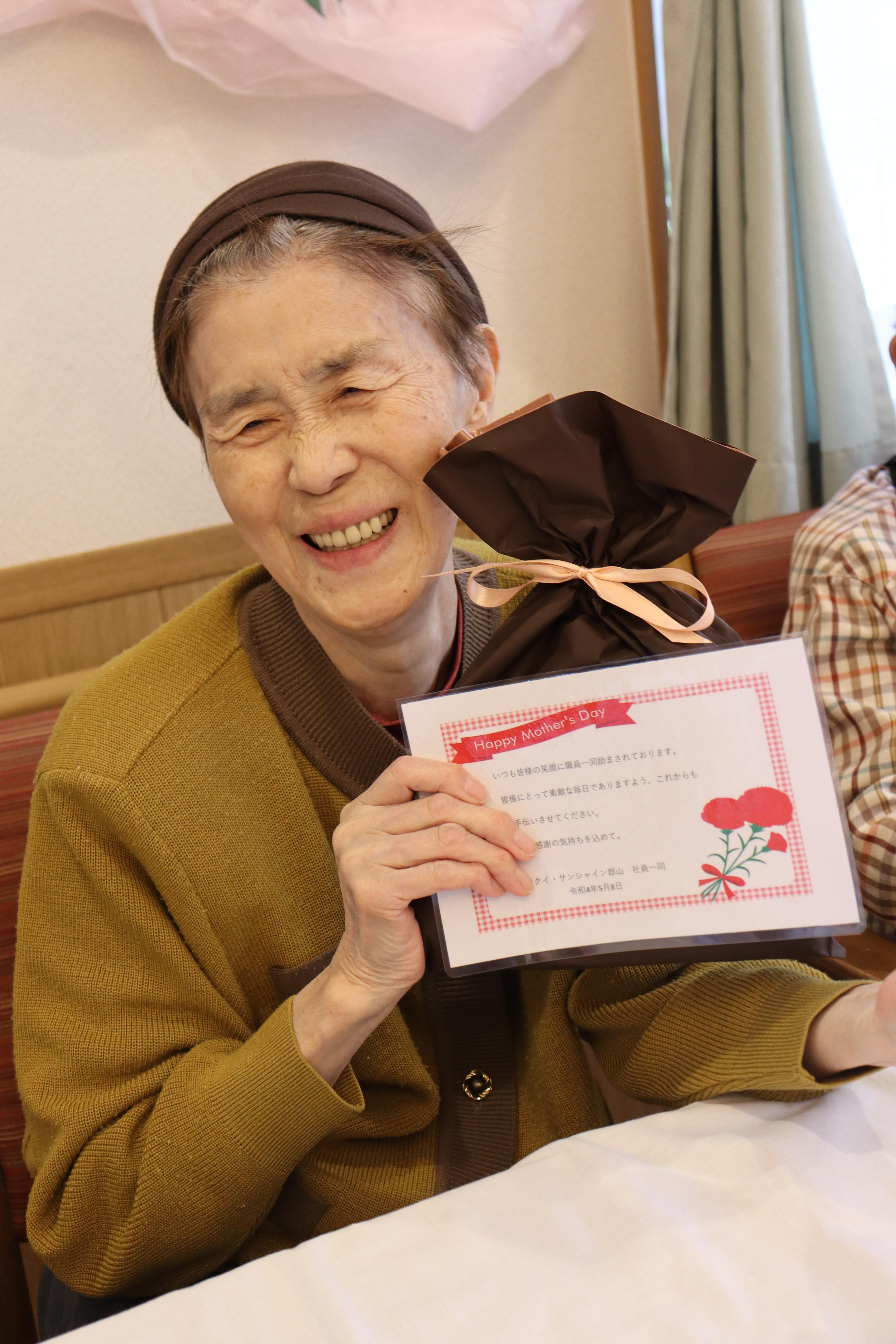 今日は母の日ということで、ささやかですが、施設からメッセージカードとタオルをプレゼントさせていただきました。メッセージカードはお部屋に飾り、タオルは早速使っていただきました!