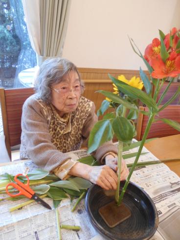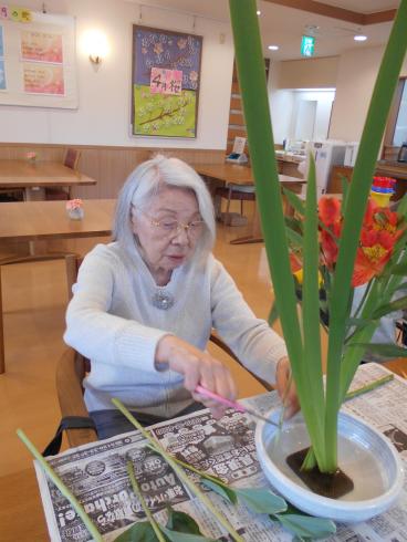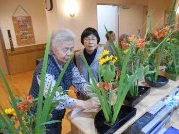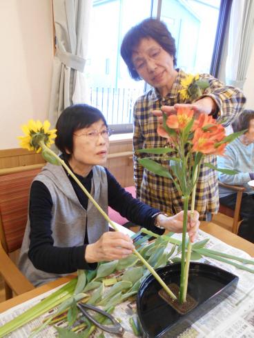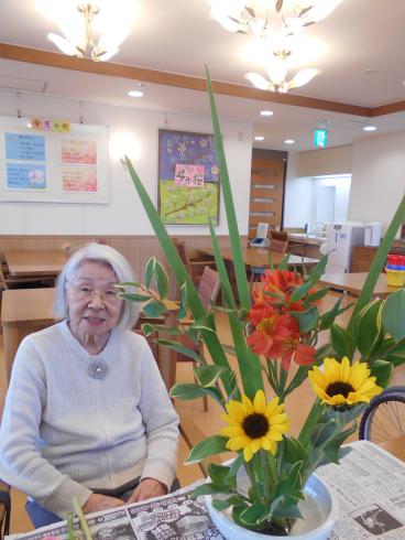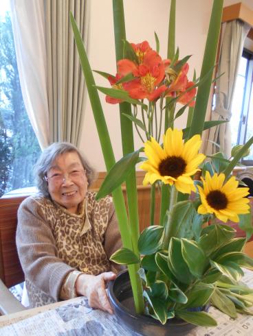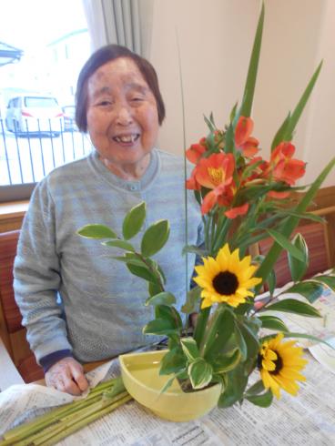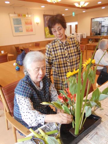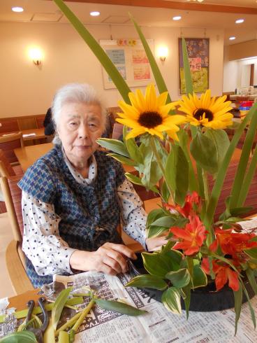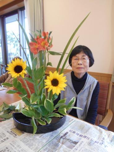 今日の生け花クラブは、暖かい季節を感じる大きなひまわりがメインに飾られる素敵なお題でした。