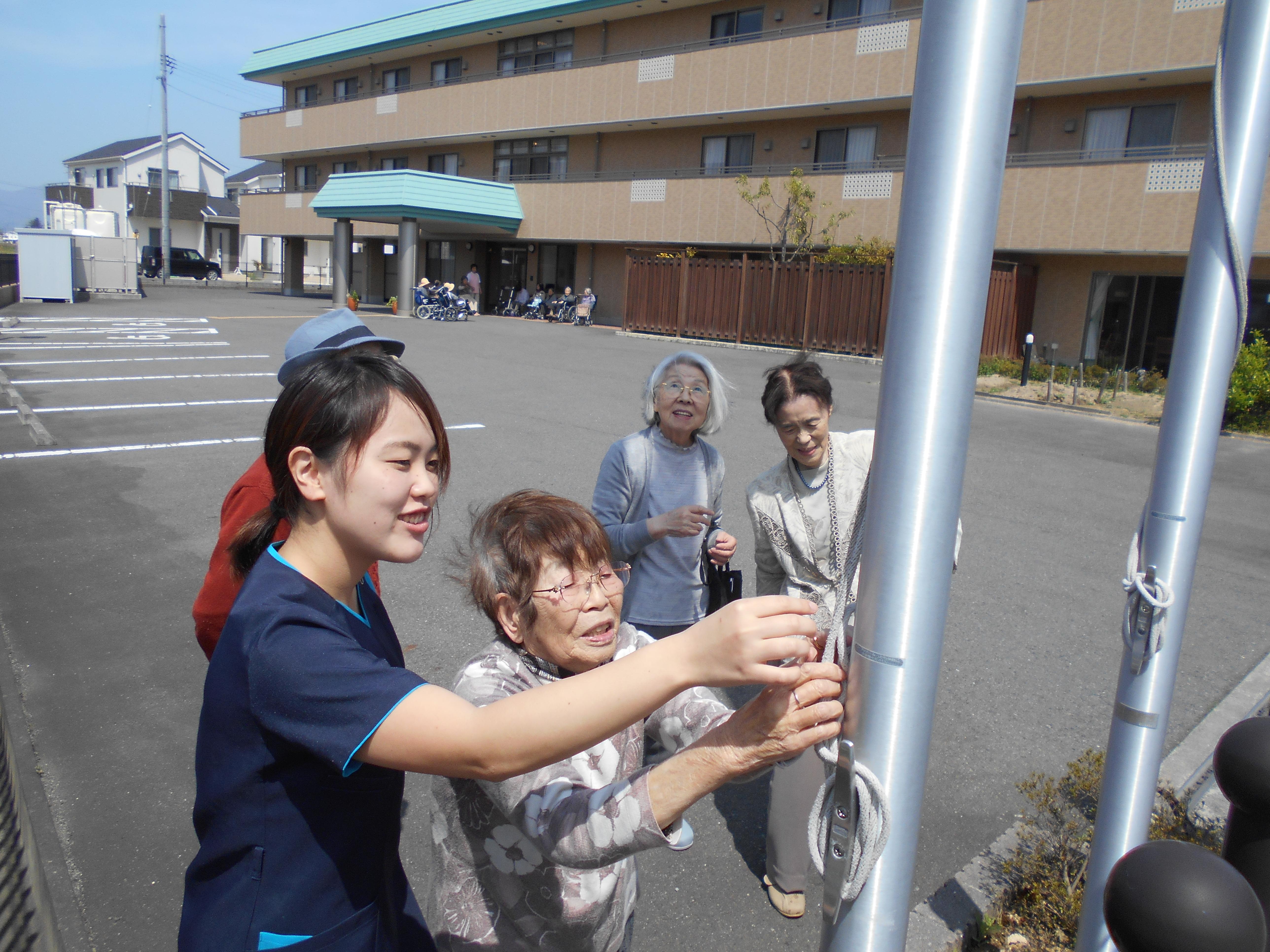 施設外周の散歩や旗揚げなど、積極的に運動や役割を持って頂くのも、皆様の健康維持の重要な要素です。
