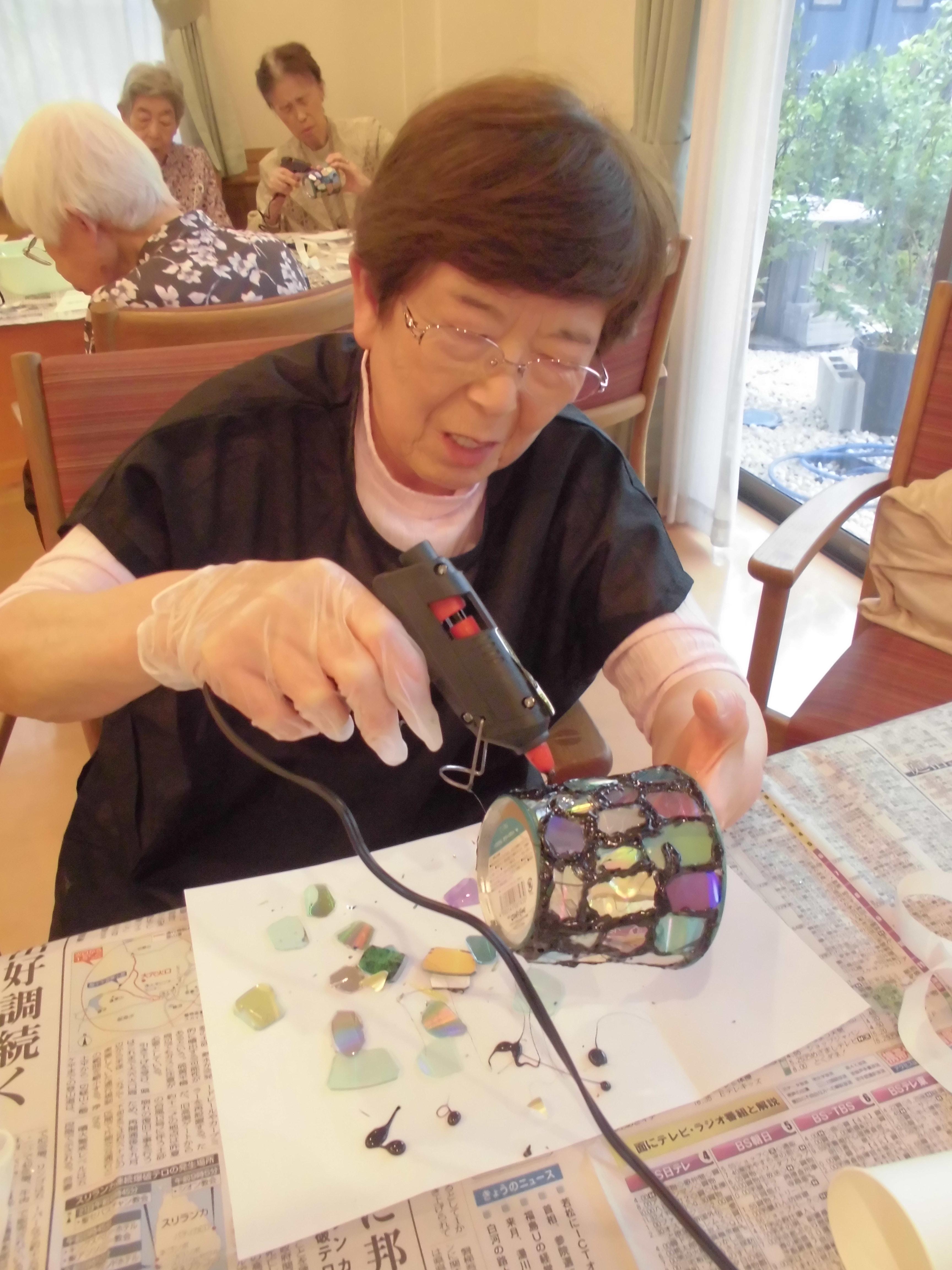 今回のサロンの制作イベントは、CDのかけらをグルーガンで容器に接着して、オリジナルのペン立てを制作して頂きました。